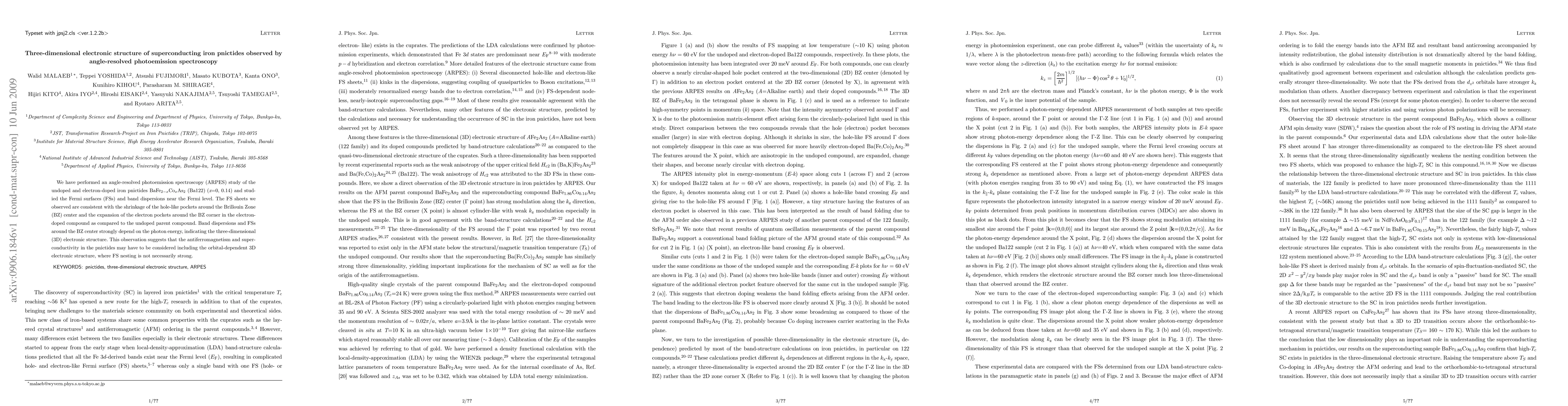 This study uses angle-resolved photoemission spectroscopy (ARPES) to reveal the three-dimensional electronic structure of superconducting iron pnictides, showing that electron doping causes changes in Fermi surface pockets and that band dispersions depend on photon energy, suggesting a complex relationship between antiferromagnetism and superconductivity in these materials.