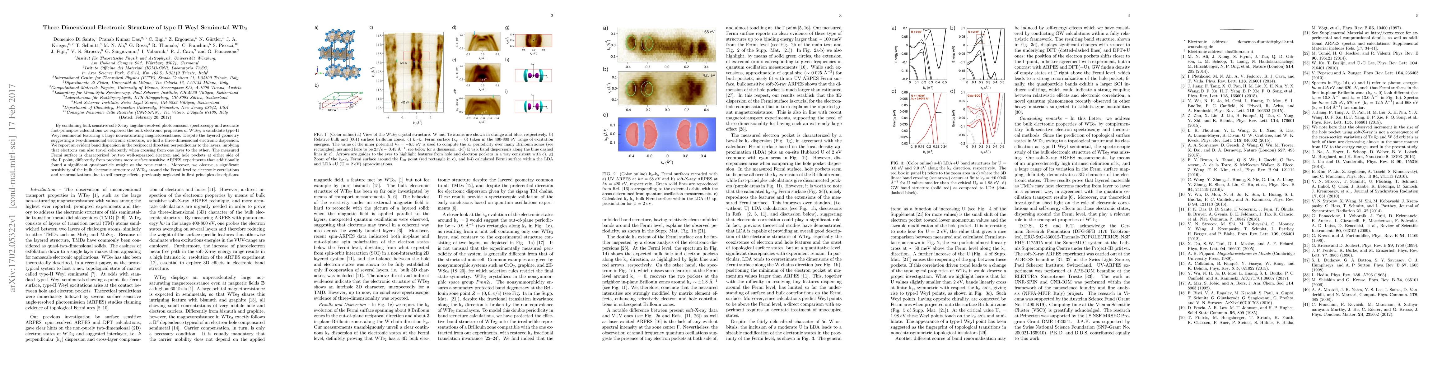 By combining bulk sensitive soft-X-ray angular-resolved photoemission spectroscopy and accurate first-principles calculations we explored the bulk electronic properties of WTe$_2$, a candidate type-II Weyl semimetal featuring a large non-saturating magnetoresistance. Despite the layered geometry suggesting a two-dimensional electronic structure, we find a three-dimensional electronic dispersion. We report an evident band dispersion in the reciprocal direction perpendicular to the layers, implying that electrons can also travel coherently when crossing from one layer to the other. The measured Fermi surface is characterized by two well-separated electron and hole pockets at either side of the $\Gamma$ point, differently from previous more surface sensitive ARPES experiments that additionally found a significant quasiparticle weight at the zone center. Moreover, we observe a significant sensitivity of the bulk electronic structure of WTe$_2$ around the Fermi level to electronic correlations and renormalizations due to self-energy effects, previously neglected in first-principles descriptions.