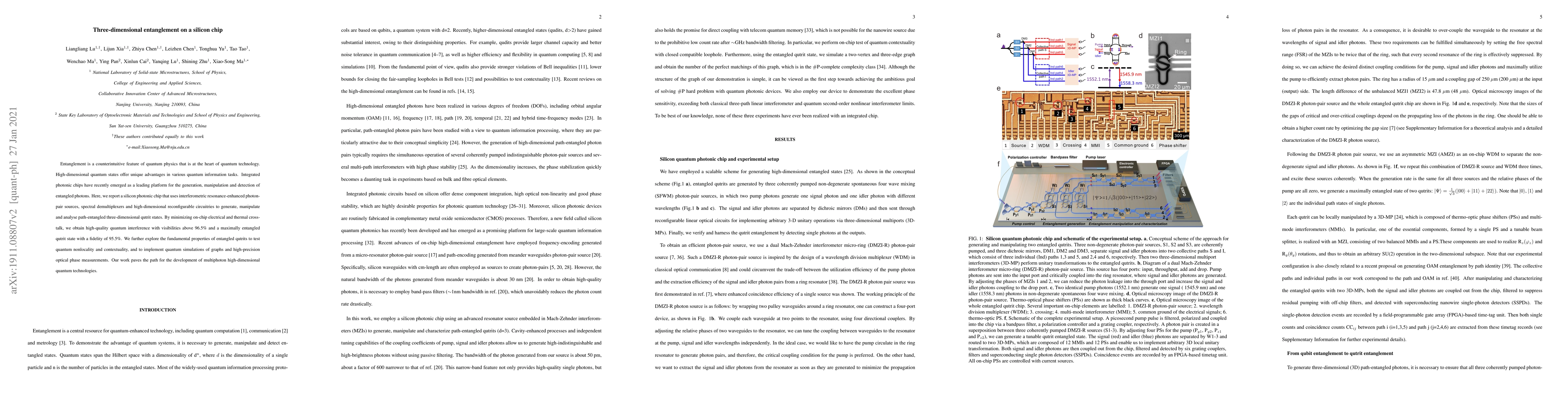 This paper reports the generation and manipulation of high-dimensional three-dimensional qutrit states on a silicon photonic chip, achieving high-quality quantum interference and fidelity. The study explores quantum nonlocality, contextuality, and applications in quantum simulations and phase measurements, paving the way for advanced multiphoton quantum technologies.