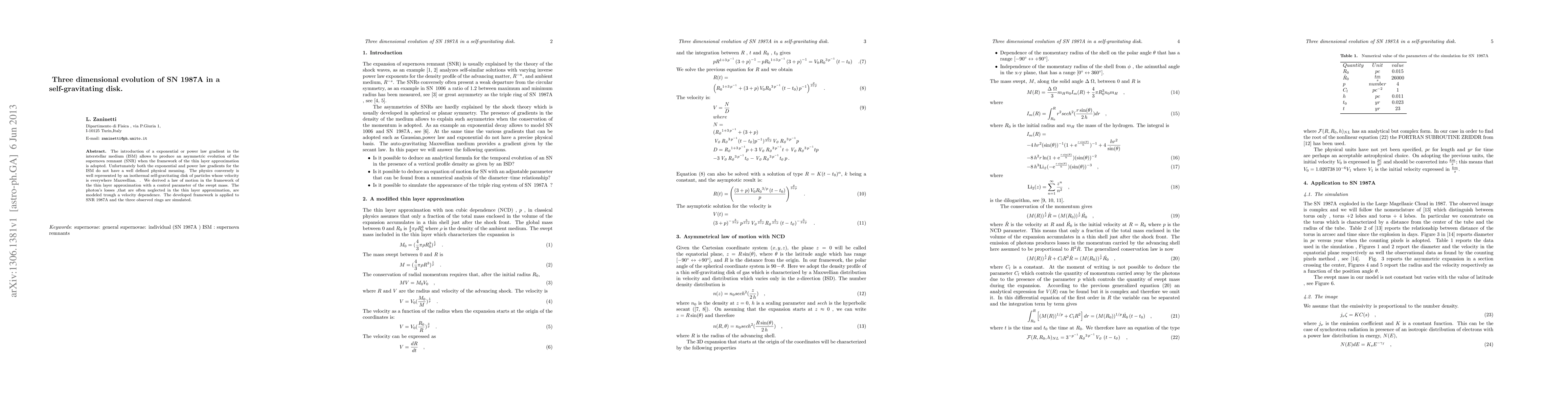 This paper develops a model for the three-dimensional evolution of supernova remnant SN 1987A using an isothermal self-gravitating disk, addressing asymmetric evolution due to ISM gradients. The model accounts for photon losses and is applied to simulate the three observed rings of SN 1987A.