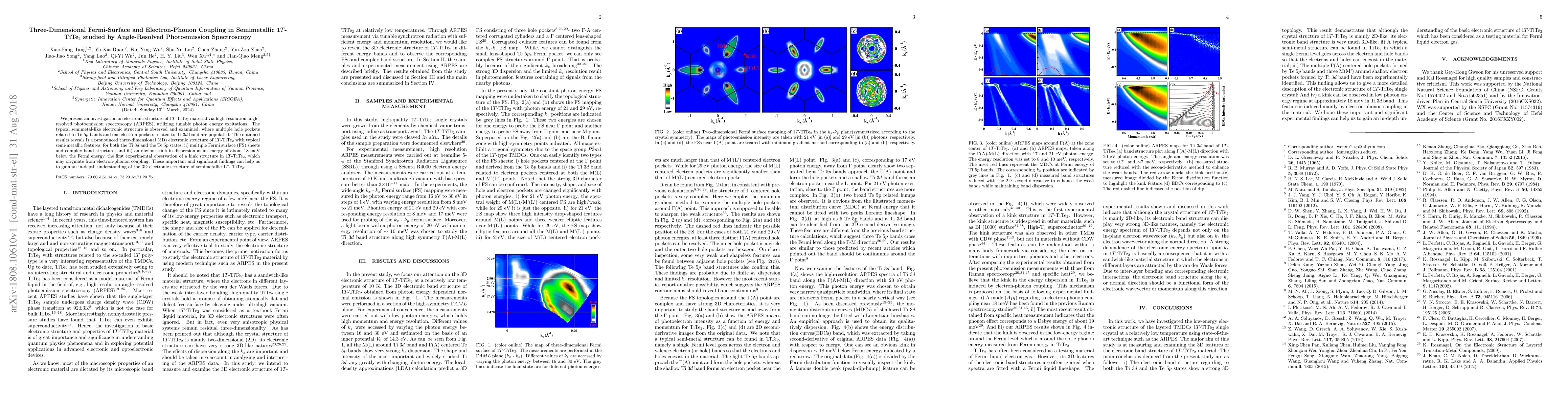 This study uses ARPES to reveal the 3D Fermi surface and complex band structure of 1T-TiTe2, identifying multiple hole and electron pockets. It also observes a kink in dispersion likely due to electron-phonon coupling, providing insights into the material's semimetallic properties.