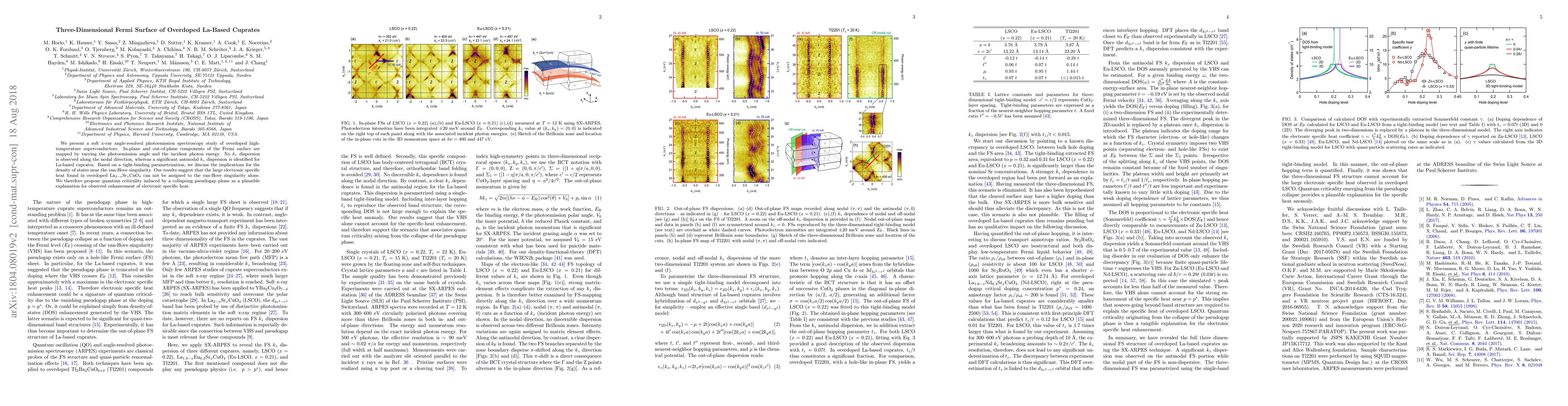 The study uses soft x-ray angle-resolved photoemission spectroscopy to map the Fermi surface of overdoped La_2-xSr_xCuO_4 and La_1.8-xEu_0.2Sr_xCuO_4. It finds no $k_z$ dispersion along the nodal direction but significant dispersion antinodally. The results suggest that the large electronic specific heat in overdoped La_2-xSr_xCuO_4 is not due to van-Hove singularity alone, proposing quantum criticality from a collapsing pseudogap phase instead.