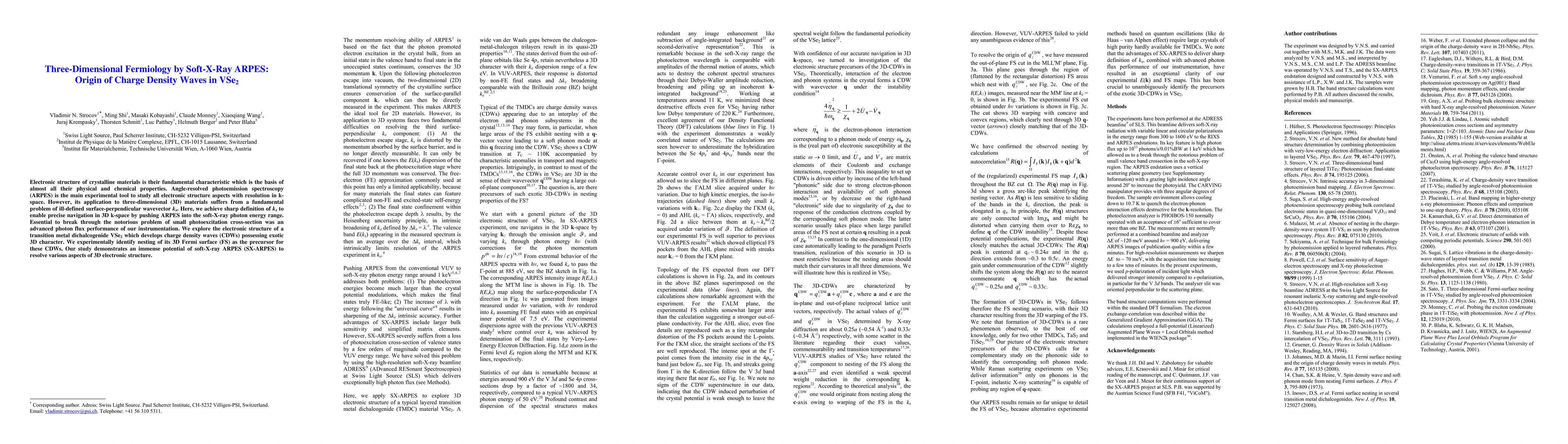 This paper utilizes advanced soft-X-ray ARPES to precisely define the 3D Fermi surface in VSe2, revealing that its 3D nesting is the origin of charge density waves. The study highlights the potential of SX-ARPES for exploring the electronic structure of 3D materials.