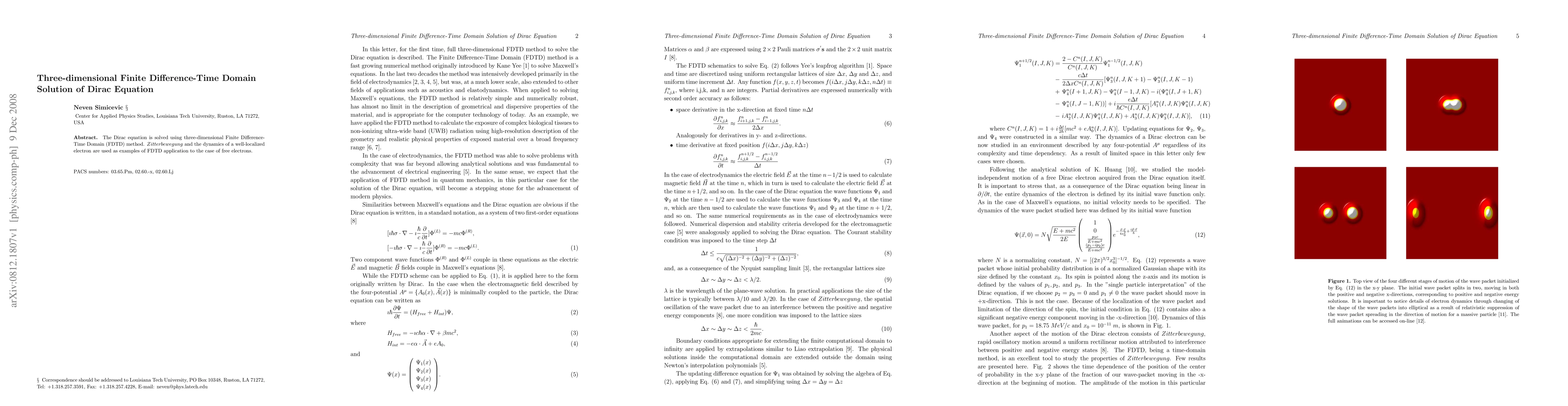 Summary: This paper presents a three-dimensional FDTD solution for the Dirac equation, demonstrating its application through the phenomena of $Zitterbewegung$ and the dynamics of a well-localized electron in free electron scenarios.