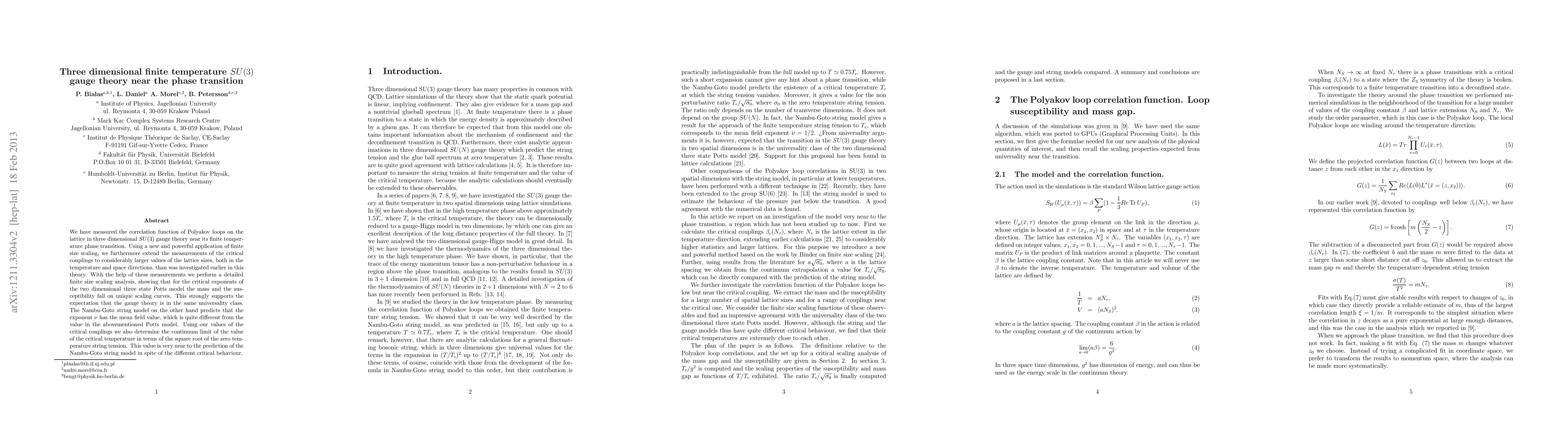 We have measured the correlation function of Polyakov loops on the lattice in three dimensional SU(3) gauge theory near its finite temperature phase transition. Using a new and powerful application of finite size scaling, we furthermore extend the measurements of the critical couplings to considerably larger values of the lattice sizes, both in the temperature and space directions, than was investigated earlier in this theory. With the help of these measurements we perform a detailed finite size scaling analysis, showing that for the critical exponents of the two dimensional three state Potts model the mass and the susceptibility fall on unique scaling curves. This strongly supports the expectation that the gauge theory is in the same universality class. The Nambu-Goto string model on the other hand predicts that the exponent \nu has the mean field value, which is quite different from the value in the abovementioned Potts model. Using our values of the critical couplings we also determine the continuum limit of the value of the critical temperature in terms of the square root of the zero temperature string tension. This value is very near to the prediction of the Nambu-Goto string model in spite of the different critical behaviour.