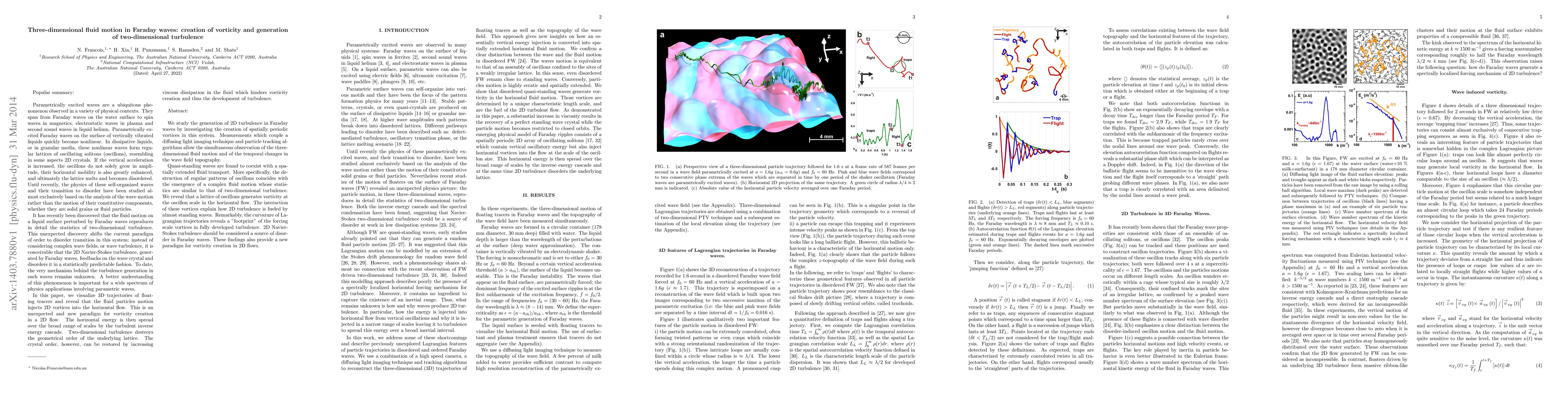 This paper investigates the emergence of two-dimensional turbulence in Faraday waves through the creation of spatially periodic vortices, revealing that the interaction of these vortices fuels the turbulence. The study uses a combination of light imaging and particle tracking to observe the three-dimensional fluid dynamics and wave field changes, showing that the destruction of regular oscillons patterns leads to complex fluid motion akin to two-dimensional turbulence.