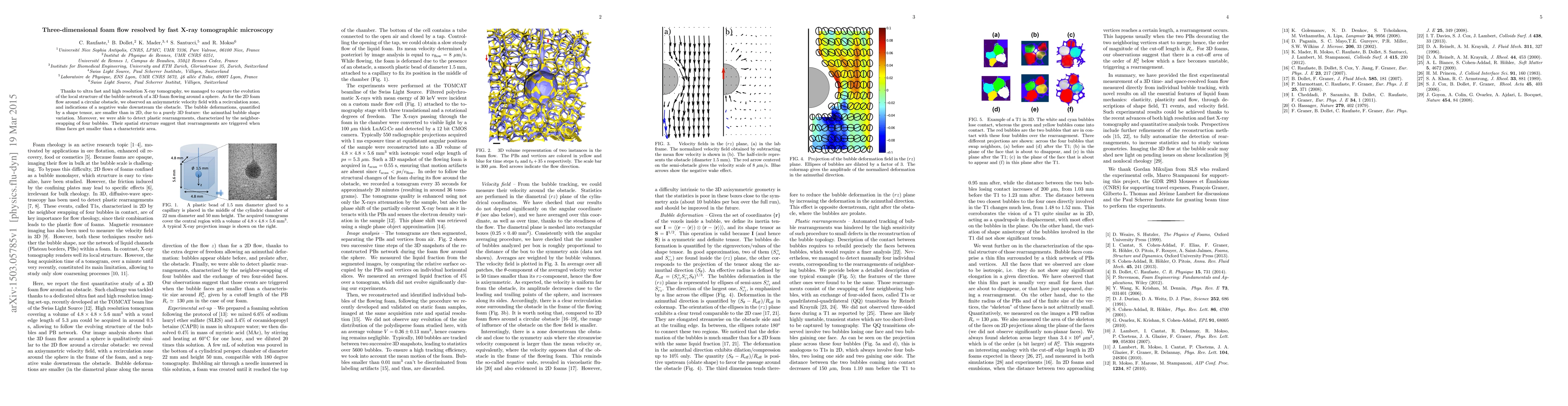 Thanks to ultra fast and high resolution X-ray tomography, we managed to capture the evolution of the local structure of the bubble network of a 3D foam flowing around a sphere. As for the 2D foam flow around a circular obstacle, we observed an axisymmetric velocity field with a recirculation zone, and indications of a negative wake downstream the obstacle. The bubble deformations, quantified by a shape tensor, are smaller than in 2D, due to a purely 3D feature: the azimuthal bubble shape variation. Moreover, we were able to detect plastic rearrangements, characterized by the neighbor-swapping of four bubbles. Their spatial structure suggest that rearrangements are triggered when films faces get smaller than a characteristic area.