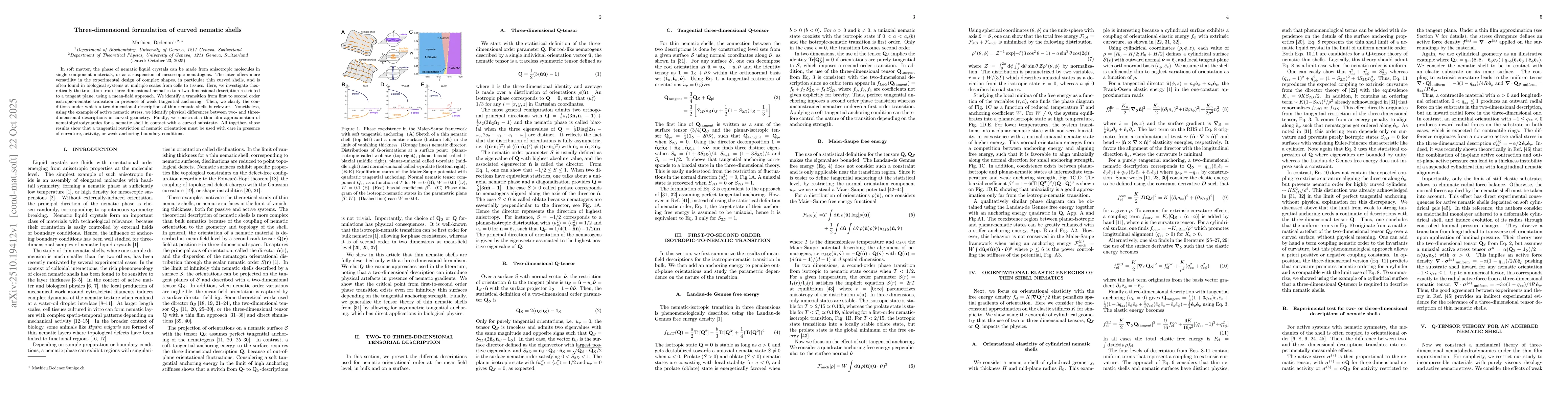 In soft matter, the phase of nematic liquid crystals can be made from anisotropic molecules in single component materials, or as a suspension of mesoscopic nematogens. The later offers more versatility in the experimental design of complex shapes, in particular thin curved shells, and is often found in biological systems at multiple scales from cells to tissues. Here, we investigate theoretically the transition from three-dimensional nematics to a two-dimensional description restricted to a tangent plane, using a mean-field approach. We identify a transition from first to second order isotropic-nematic transition in presence of weak tangential anchoring. Then, we clarify the conditions under which a two-dimensional description of thin nematic shells is relevant. Nonetheless, using the example of active nematic stress, we identify physical differences between two- and three-dimensional descriptions in curved geometry. Finally, we construct a thin film approximation of nematohydrodynamics for a nematic shell in contact with a curved substrate. All together, those results show that a tangential restriction of nematic orientation must be used with care in presence of curvature, activity, or weak anchoring boundary conditions.