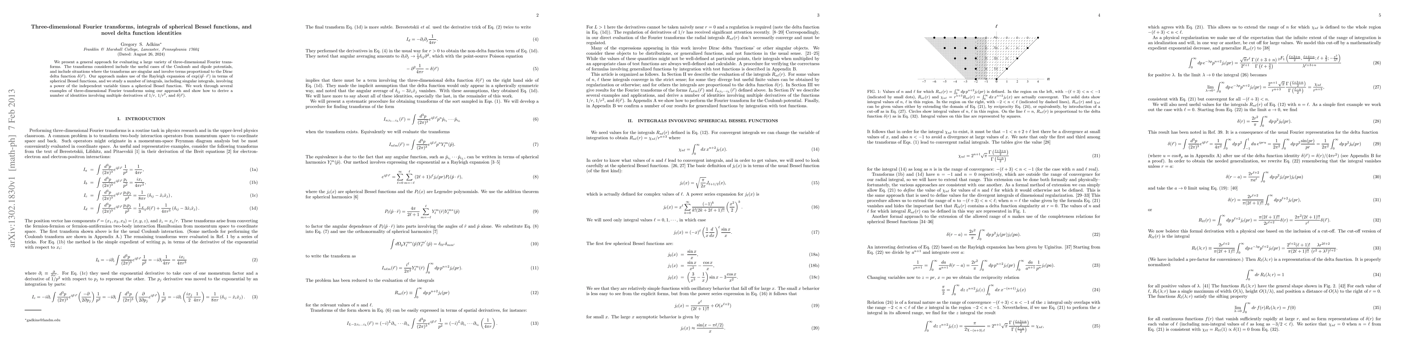 This paper proposes a method for evaluating three-dimensional Fourier transforms, particularly for Coulomb and dipole potentials, utilizing spherical Bessel functions and Rayleigh expansion. It also develops novel delta function identities through the study of singular integrals involving spherical Bessel functions.