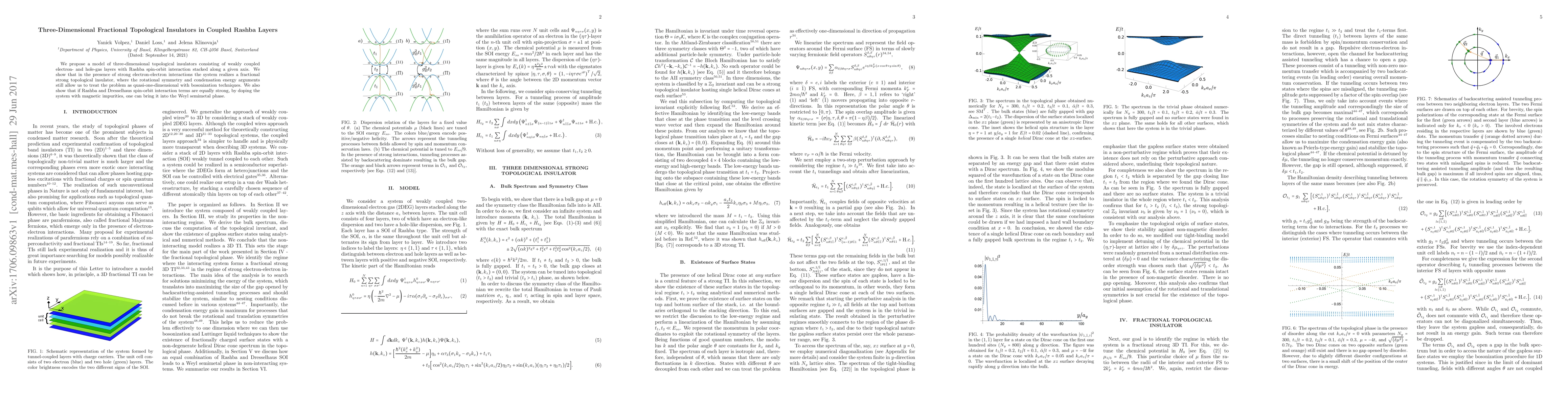 We propose a model of three-dimensional topological insulators consisting of weakly coupled electron- and hole-gas layers with Rashba spin-orbit interaction stacked along a given axis. We show that in the presence of strong electron-electron interactions the system realizes a fractional strong topological insulator, where the rotational symmetry and condensation energy arguments still allow us to treat the problem as quasi-one-dimensional with bosonization techniques. We also show that if Rashba and Dresselhaus spin-orbit interaction terms are equally strong, by doping the system with magnetic impurities, one can bring it into the Weyl semimetal phase.