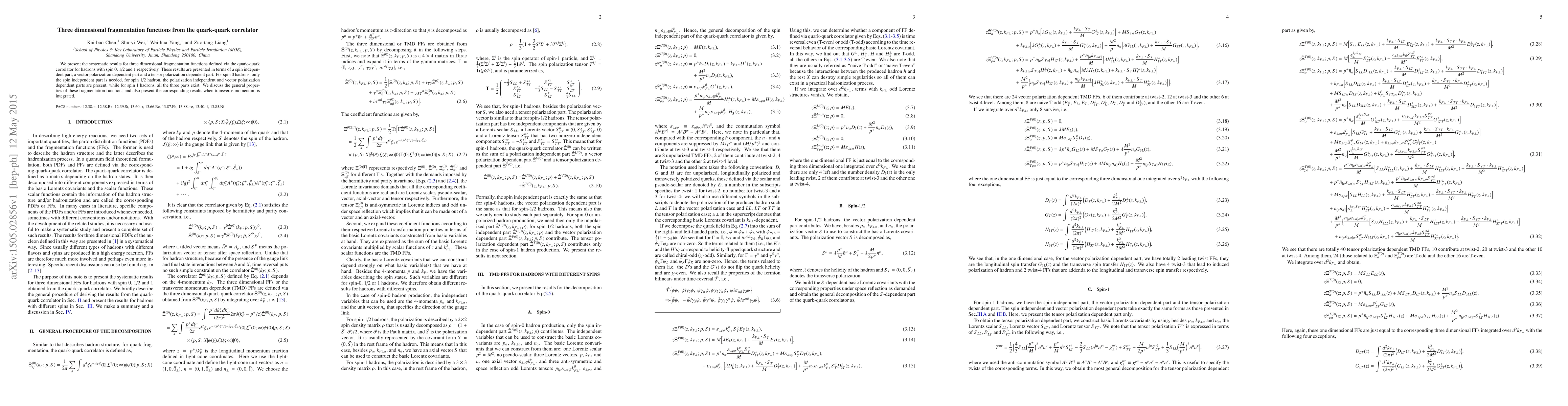 This paper presents systematic results for three-dimensional fragmentation functions derived from the quark-quark correlator for hadrons with spins 0, 1/2, and 1. It categorizes these functions into spin-independent, vector polarization dependent, and tensor polarization dependent parts, discussing their properties and implications for integrated transverse momentum cases.
