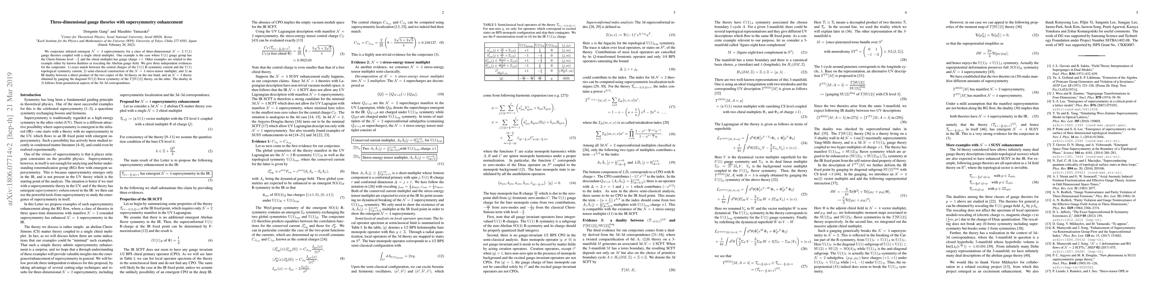 We conjecture infrared emergent $\mathcal{N}=4$ supersymmetry for a class of three-dimensional $\mathcal{N}=2$ $U(1)$ gauge theories coupled with a single chiral multiplet. One example is the case where $U(1)$ gauge group has the Chern-Simons level $-\frac{3}2$ and the chiral multiplet has gauge charge $+1$. Other examples are related to this example either by known dualities or rescaling the Abelian gauge field. We give three independent evidences for the conjecture: 1) exact match between the central charges of the $U(1)$ R-symmetry current and the $U(1)$ topological symmetry current, 2) semi-classical construction of the $\mathcal{N}=4$ stress-tensor multiplet, and 3) an IR duality between a direct product of the two copies of the 3d theory on the one hand, and an $\mathcal{N}=4$ theory obtained by gauging the diagonal $SU(2)$ flavor symmetry of the $T[SU(2)]$ theory, on the other. The duality in 3) follows from geometrical aspects of the 3d-3d correspondence.