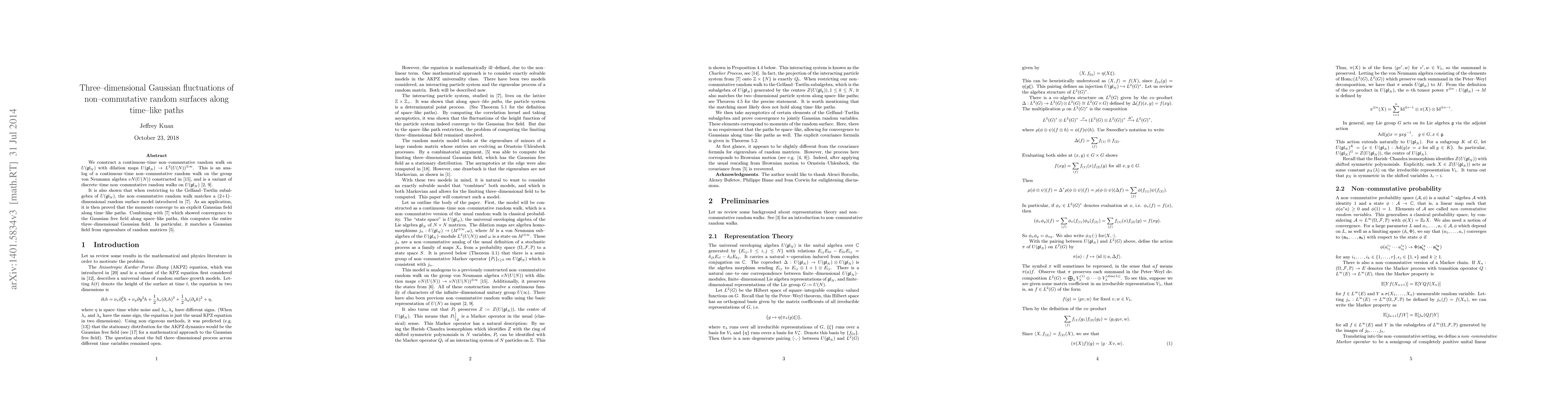 We construct a continuous-time non-commutative random walk on $U(\mathfrak{gl}_N)$ with dilation maps $U(\mathfrak{gl}_N)\rightarrow L^2(U(N))^{\otimes\infty}$. This is an analog of a continuous-time non-commutative random walk on the group von Neumann algebra $vN(U(N))$ constructed in [15], and is a variant of discrete-time non-commutative random walks on $U(\mathfrak{gl}_N)$ [2,9]. It is also shown that when restricting to the Gelfand-Tsetlin subalgebra of $U(\mathfrak{gl}_N),$ the non-commutative random walk matches a (2+1)-dimensional random surface model introduced in [7]. As an application, it is then proved that the moments converge to an explicit Gaussian field along time-like paths. Combining with [7] which showed convergence to the Gaussian free field along space-like paths, this computes the entire three-dimensional Gaussian field. In particular, it matches a Gaussian field from eigenvalues of random matrices [5].