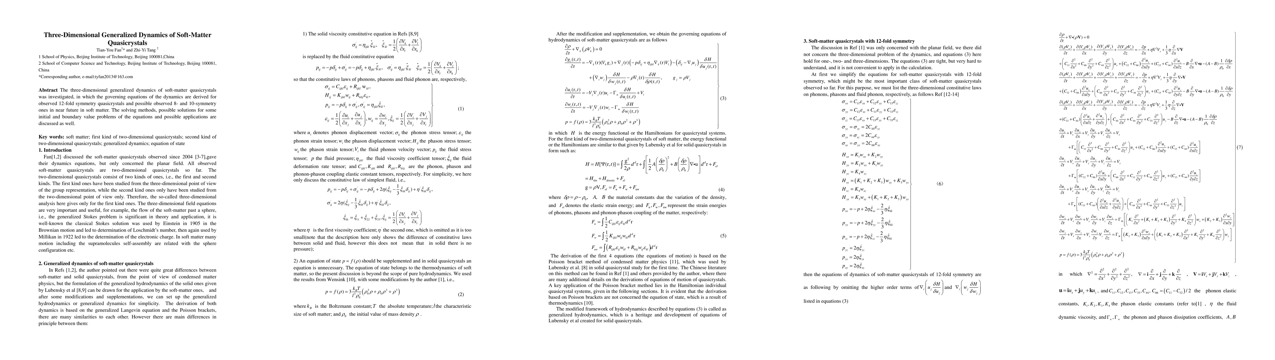 This paper investigates the three-dimensional generalized dynamics of soft-matter quasicrystals, deriving governing equations for 12-fold symmetry quasicrystals and exploring potential dynamics for 8- and 10-fold symmetries. It discusses solving methods and potential applications for these quasicrystal structures.