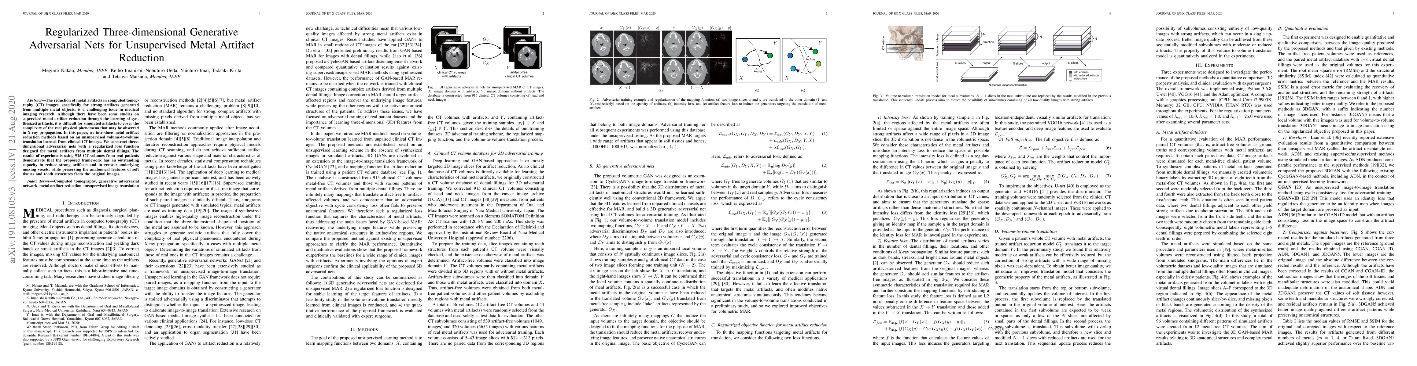 This paper proposes an unsupervised three-dimensional generative adversarial network (GAN) for reducing metal artifacts in CT images, particularly from dental fillings. The method effectively reduces artifacts and recovers missing voxels while preserving anatomical features, as demonstrated by experiments on 915 clinical CT volumes.
