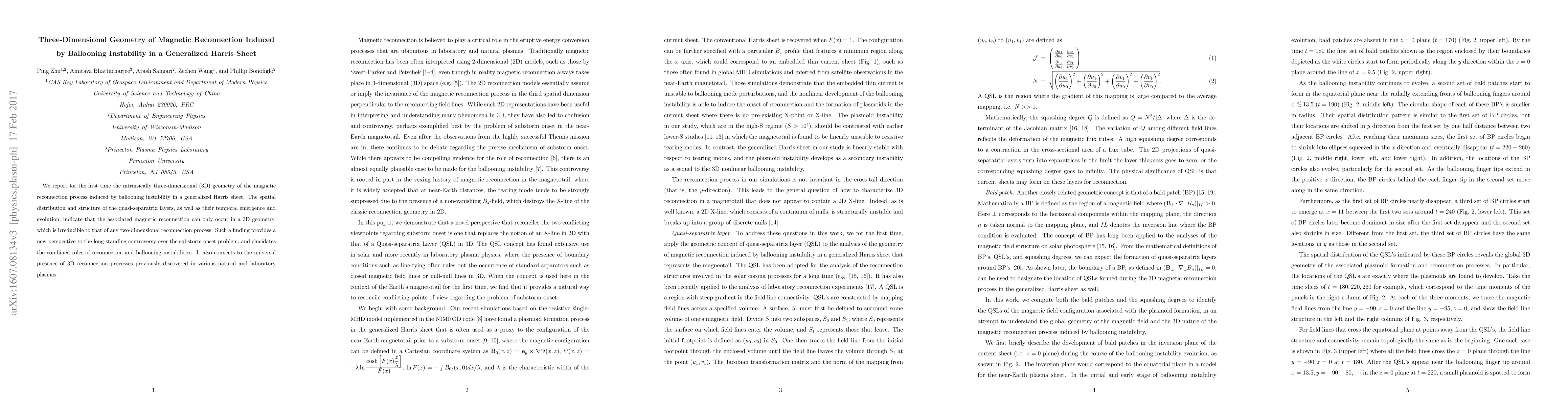 This paper reveals the three-dimensional geometry of magnetic reconnection caused by ballooning instability in a generalized Harris sheet, demonstrating that such reconnection is inherently three-dimensional and irreducible to two-dimensional models. This finding sheds new light on the substorm onset problem and highlights the interplay between reconnection and ballooning instabilities.