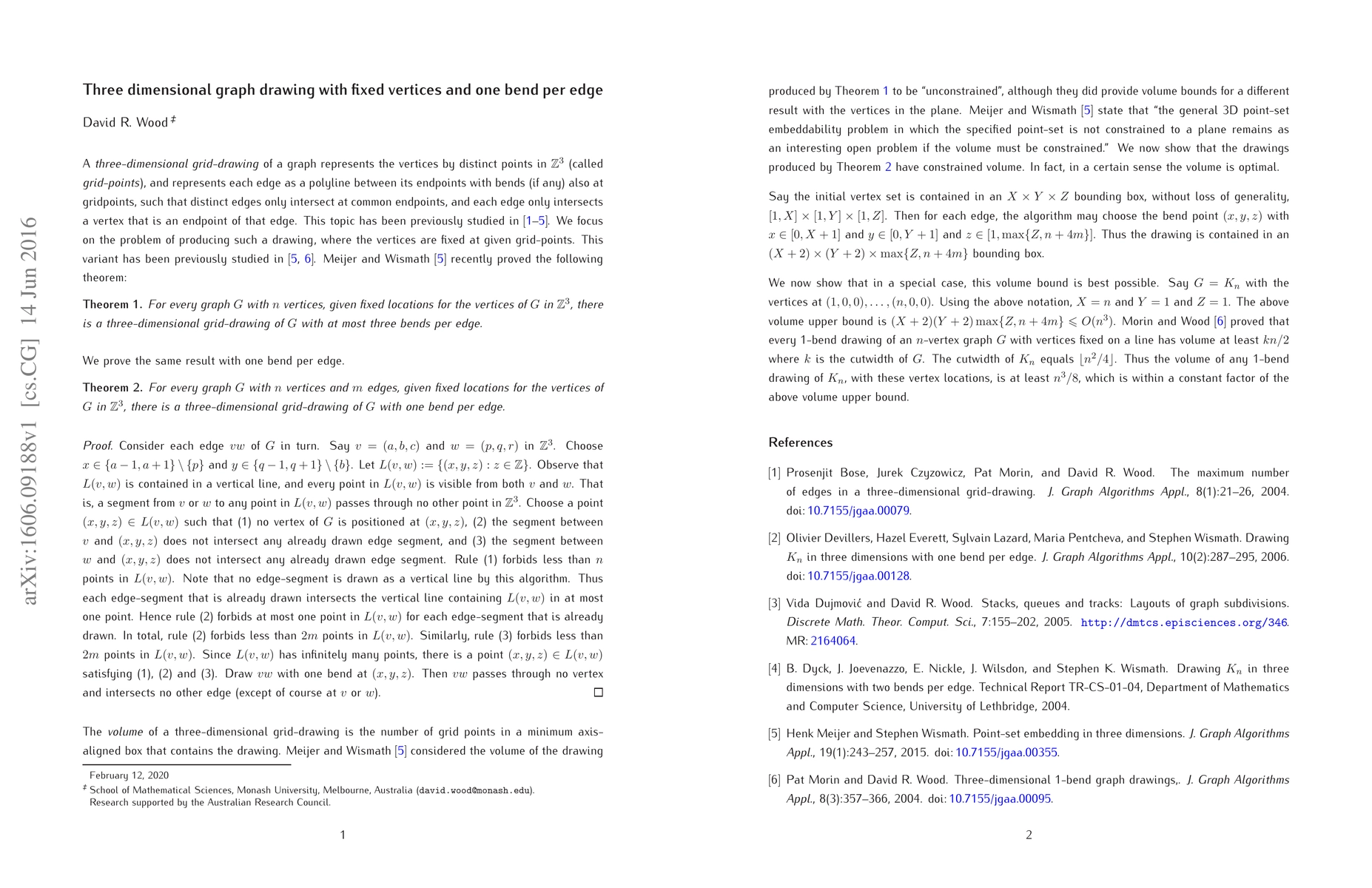 Summary: This paper demonstrates that any graph with fixed 3D integer vertex locations can be drawn in three dimensions with a grid-like structure, allowing only one bend per edge, improving the previous best bound of three bends per edge.
