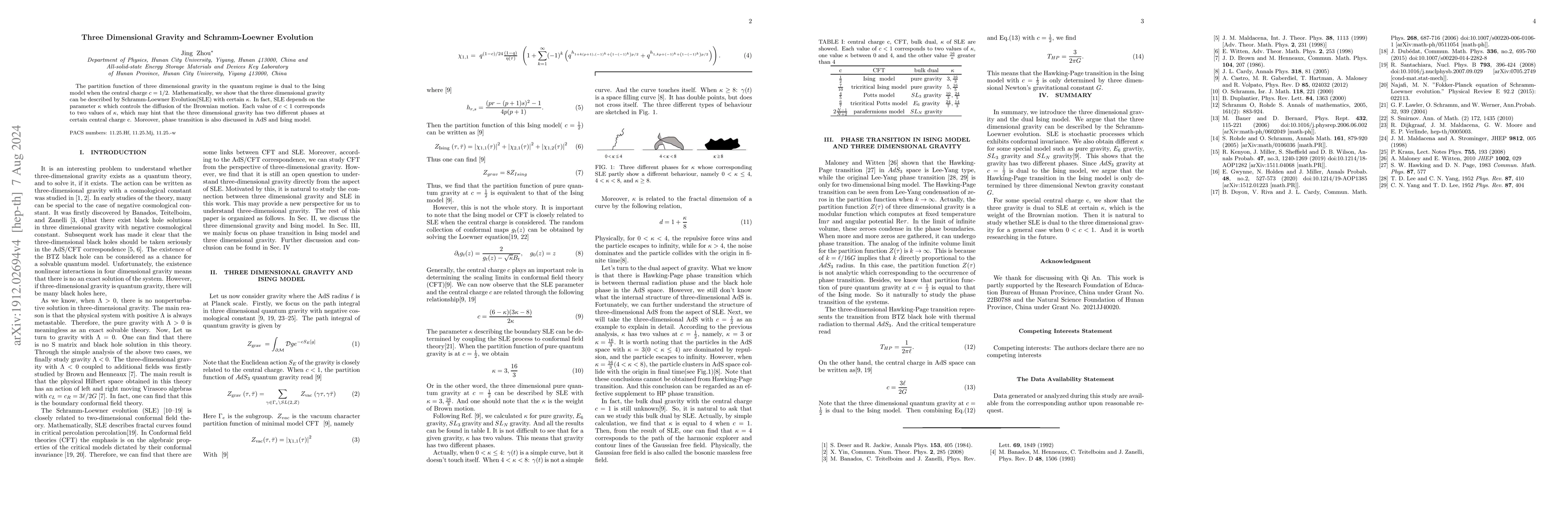The partition function of three dimensional gravity in the quantum level, where the AdS radius $\ell$ is Planck scale, is dual to the Ising model when the central charge $c=3\ell/2G$ is $1/2$. Mathematically, we show that the three dimensional gravity can be described by Schramm-Loewner Evolution(SLE) with certain $\kappa$. In fact, SLE depends on the parameter $\kappa$ which controls the diffusion of the Brownian motion. Since every value of $c < 1$ corresponding to two values of $\kappa$, then it may hint that the three dimensional gravity has two different phases at certain central charge c. Moreover, phase transition is also discussed in Ads and Ising model.