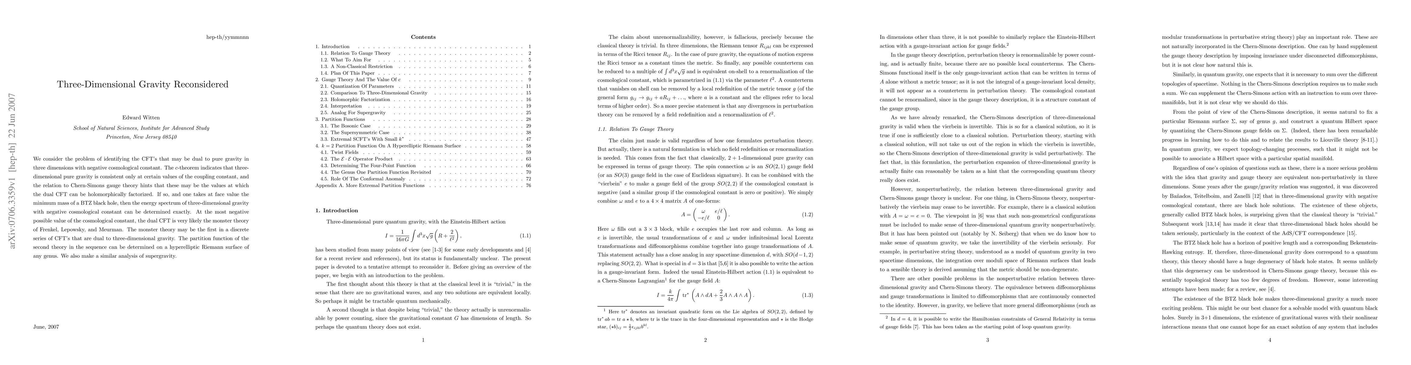 We consider the problem of identifying the CFT's that may be dual to pure gravity in three dimensions with negative cosmological constant. The c-theorem indicates that three-dimensional pure gravity is consistent only at certain values of the coupling constant, and the relation to Chern-Simons gauge theory hints that these may be the values at which the dual CFT can be holomorphically factorized. If so, and one takes at face value the minimum mass of a BTZ black hole, then the energy spectrum of three-dimensional gravity with negative cosmological constant can be determined exactly. At the most negative possible value of the cosmological constant, the dual CFT is very likely the monster theory of Frenkel, Lepowsky, and Meurman. The monster theory may be the first in a discrete series of CFT's that are dual to three-dimensional gravity. The partition function of the second theory in the sequence can be determined on a hyperelliptic Riemann surface of any genus. We also make a similar analysis of supergravity.