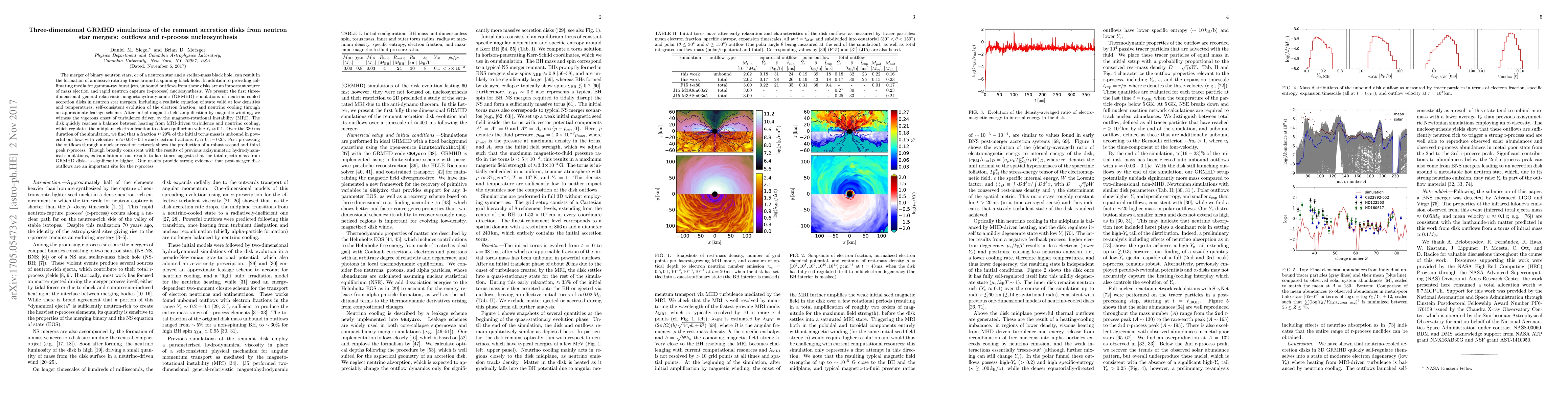 This paper presents the first three-dimensional GRMHD simulations of accretion disks formed after neutron star mergers, showing that outflows from these disks contribute significantly to r-process nucleosynthesis. The simulations reveal that about 20% of the disk mass is ejected in outflows, supporting the idea that these outflows are crucial sites for the production of heavy elements.