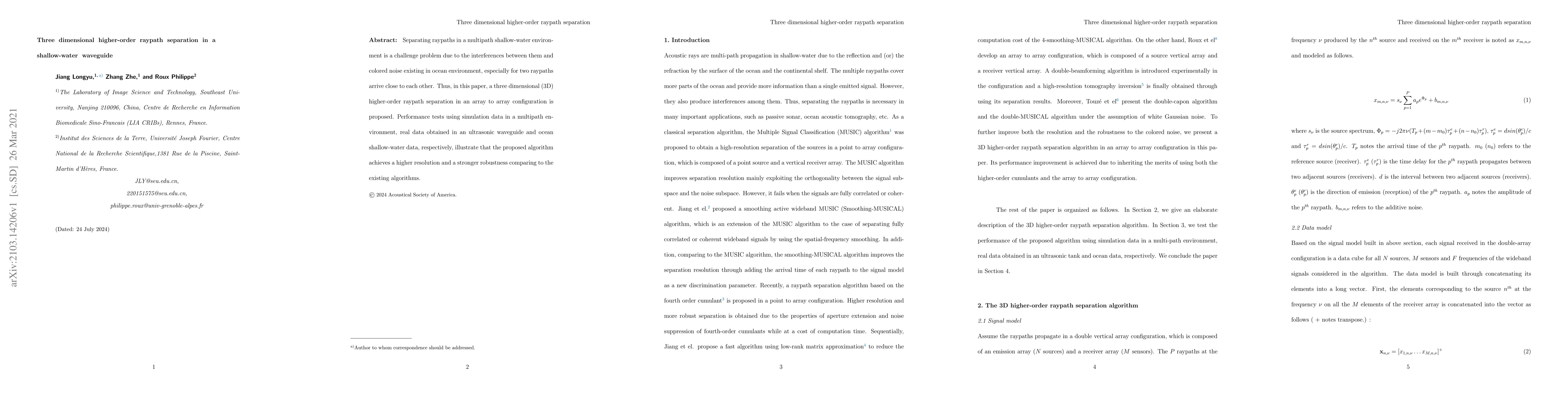 Separating raypaths in a multipath shallow-water environment is a challenge problem due to the interferences between them and colored noise existing in ocean environment, especially for two raypaths arrive close to each other. Thus, in this paper, a three dimensional (3D) higher-order raypath separation in an array to array configuration is proposed. Performance tests using simulation data in a multipath environment, real data obtained in an ultrasonic waveguide and ocean shallow-water data, respectively, illustrate that the proposed algorithm achieves a higher resolution and a stronger robustness comparing to the existing algorithms.