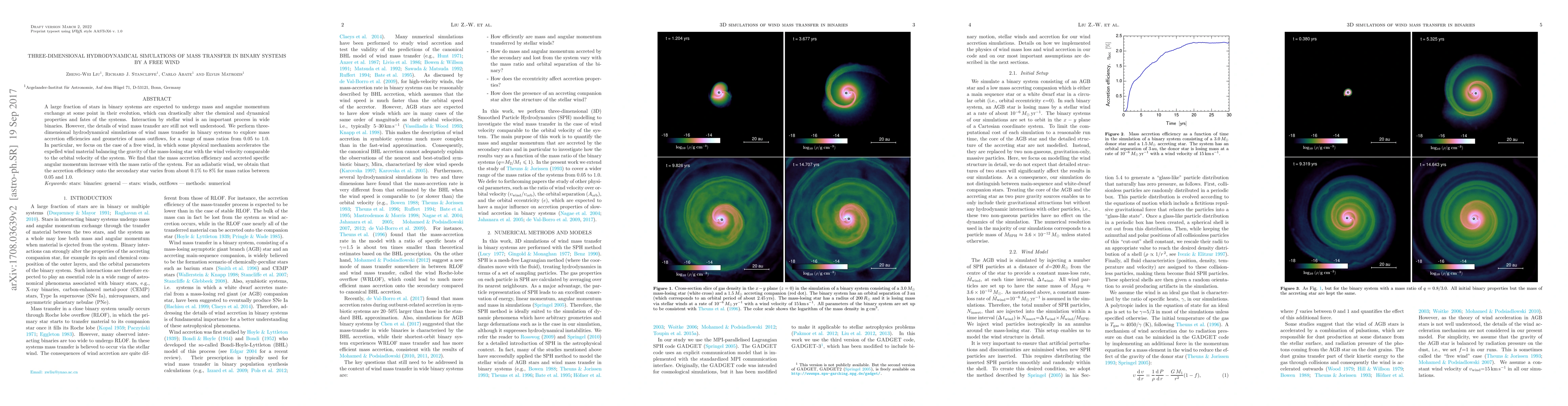 This paper presents three-dimensional hydrodynamical simulations of mass transfer in binary systems driven by a free wind, revealing increased mass accretion efficiency and specific angular momentum with higher mass ratios. The study finds accretion efficiency ranging from 0.1% to 8% for mass ratios from 0.05 to 1.0.