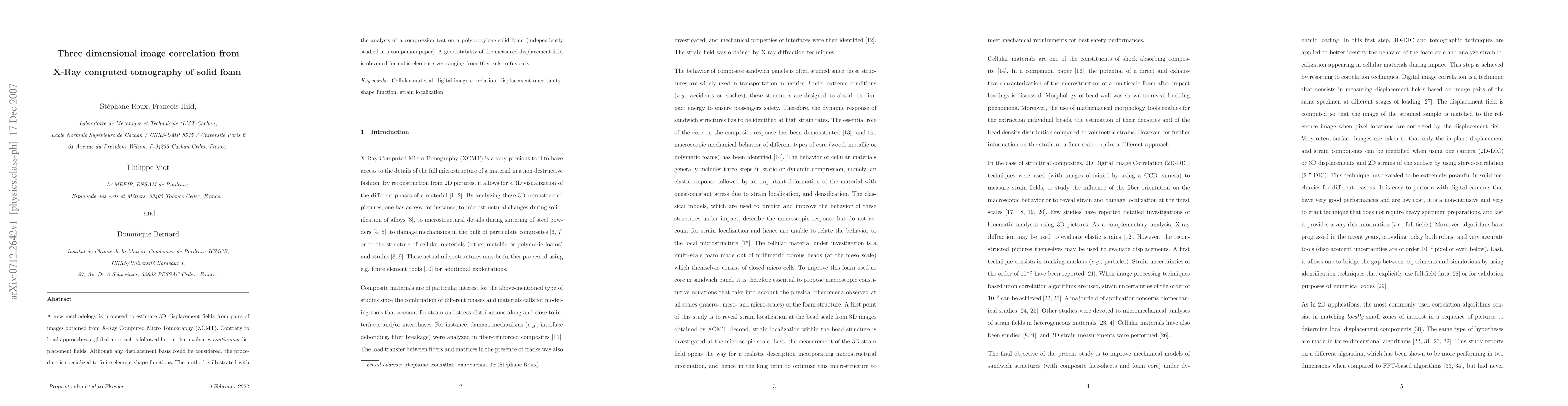 A new methodology is proposed to estimate 3D displacement fields from pairs of images obtained from X-Ray Computed Micro Tomography (XCMT). Contrary to local approaches, a global approach is followed herein that evaluates {\em continuous} displacement fields. Although any displacement basis could be considered, the procedure is specialized to finite element shape functions. The method is illustrated with the analysis of a compression test on a polypropylene solid foam (independently studied in a companion paper). A good stability of the measured displacement field is obtained for cubic element sizes ranging from 16 voxels to 6 voxels.