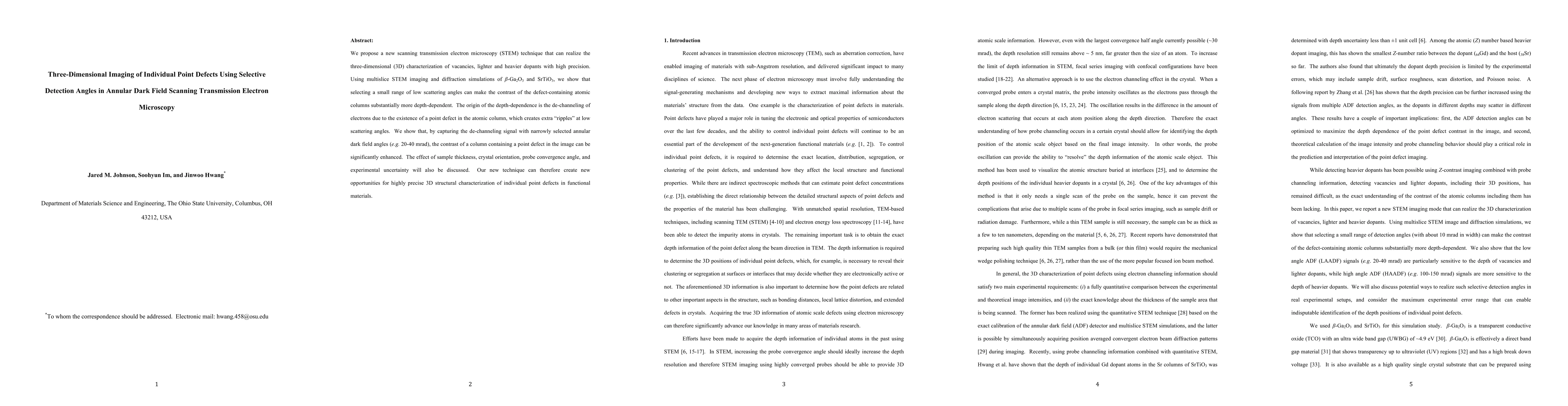 This paper introduces a novel STEM technique for precise 3D imaging of point defects using selective detection angles, enhancing contrast through de-channeling signals captured at specific annular dark field angles. The method's effectiveness is demonstrated through multislice simulations and analysis of material samples.