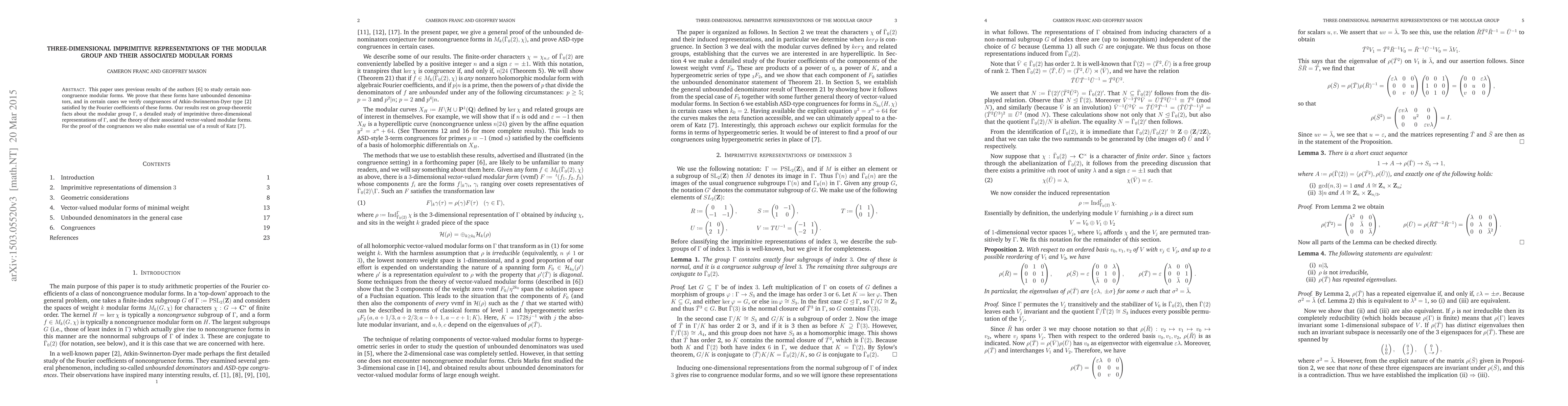 This paper investigates non-congruence modular forms through their three-dimensional imprimitive representations of the modular group, proving that these forms have unbounded denominators and verifying Atkin-Swinnerton-Dyer type congruences for their Fourier coefficients using group-theoretic insights and Katz's result.