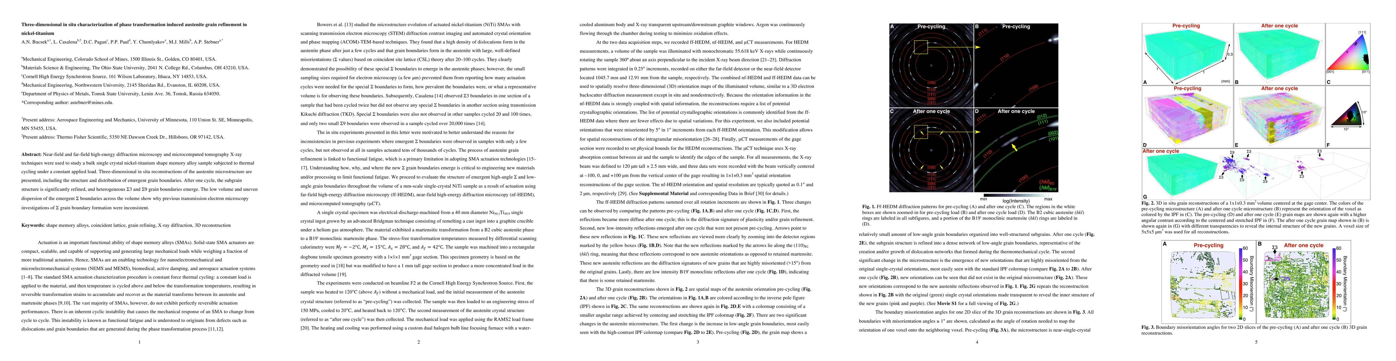 This study uses high-energy diffraction microscopy and microcomputed tomography to investigate phase transformation-induced austenite grain refinement in nickel-titanium shape memory alloys under thermal cycling. The research reveals significant subgrain refinement and the emergence of heterogeneous Σ3 and Σ9 grain boundaries, explaining inconsistencies in previous electron microscopy studies.