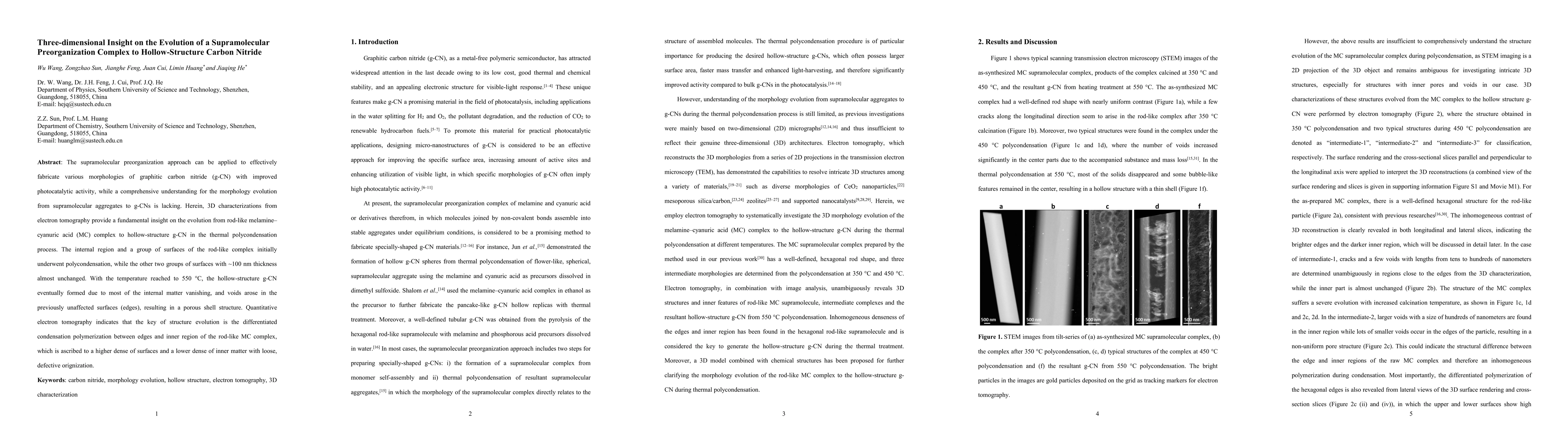 Researchers used electron tomography to study how a supramolecular complex transforms into a hollow-structure carbon nitride through thermal polycondensation. The key finding is that the differentiated condensation polymerization between edges and inner regions of the complex determines its structure evolution.