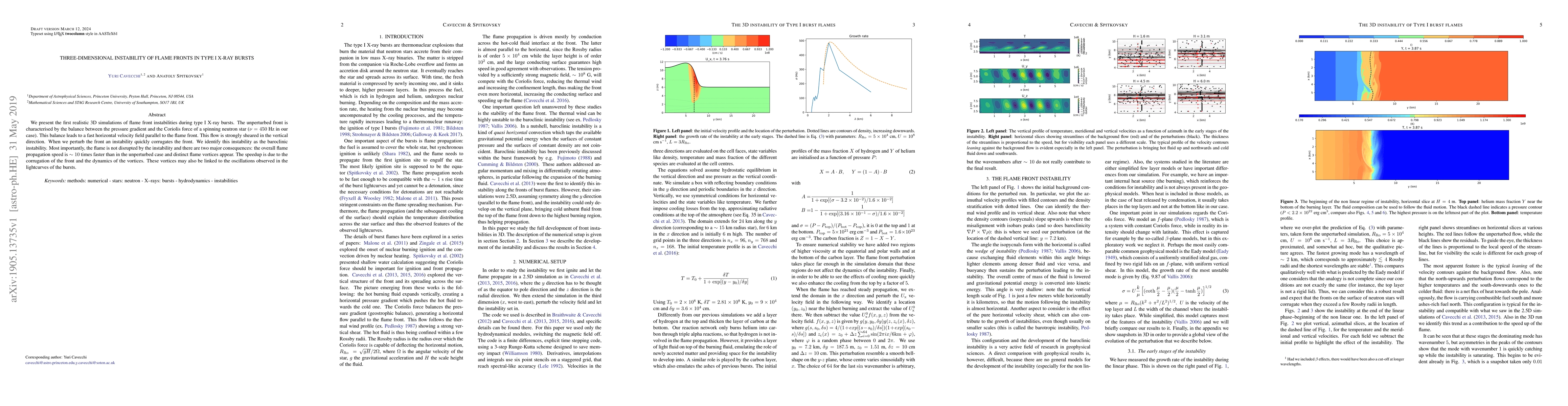 We present the first realistic 3D simulations of flame front instabilities during type I X-ray bursts. The unperturbed front is characterised by the balance between the pressure gradient and the Coriolis force of a spinning neutron star ({\nu} = 450 Hz in our case). This balance leads to a fast horizontal velocity field parallel to the flame front. This flow is strongly sheared in the vertical direction. When we perturb the front an instability quickly corrugates the front. We identify this instability as the baroclinic instability. Most importantly, the flame is not disrupted by the instability and there are two major consequences: the overall flame propagation speed is {\sim} 10 times faster than in the unperturbed case and distinct flame vortices appear. The speedup is due to the corrugation of the front and the dynamics of the vortices. These vortices may also be linked to the oscillations observed in the lightcurves of the bursts.