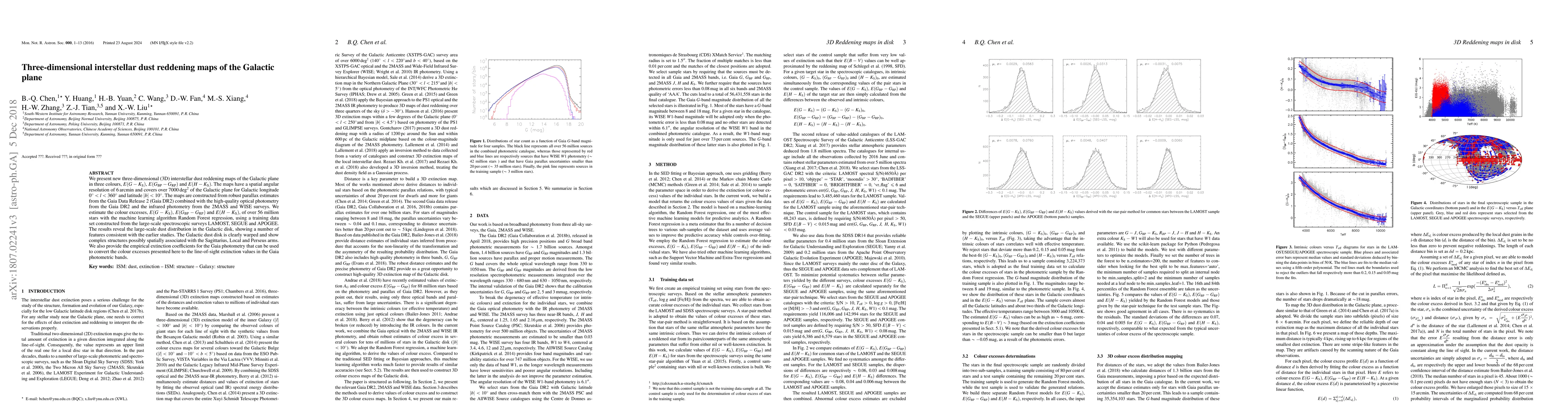 This paper presents new three-dimensional interstellar dust reddening maps of the Galactic plane using Gaia DR2, 2MASS, and WISE data, revealing large-scale dust distribution and complex structures associated with major Galactic arms. The maps provide empirical extinction coefficients for converting colour excesses to line-of-sight extinction values.