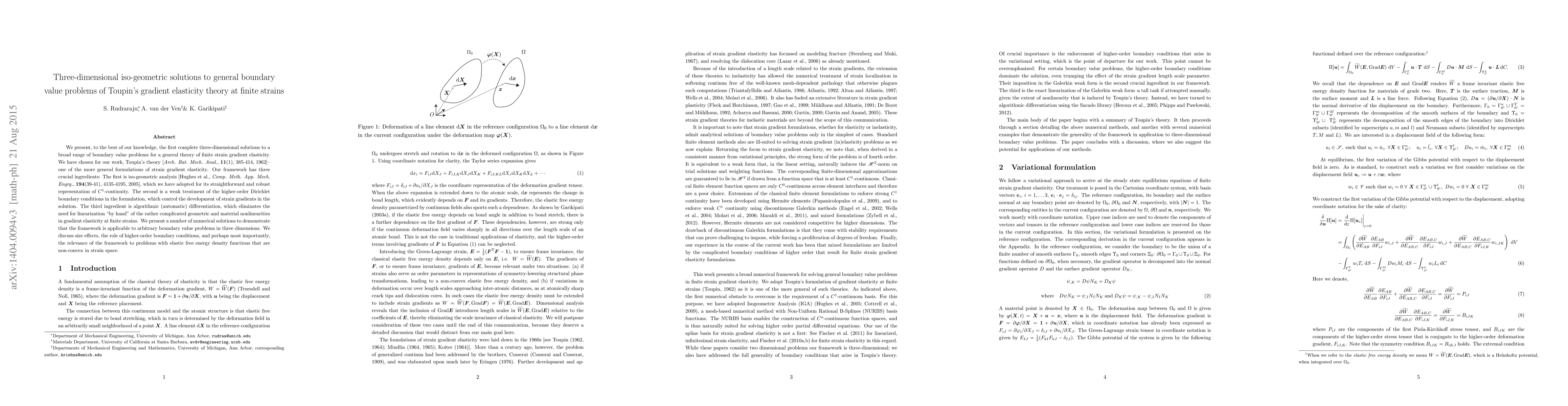 This paper presents the first complete three-dimensional numerical solutions for Toupin's gradient elasticity theory at finite strains using iso-geometric analysis, a weak treatment of higher-order boundary conditions, and algorithmic differentiation. The framework demonstrates applicability to various boundary value problems, highlighting size effects and the relevance of non-convex elastic free energy density functions.