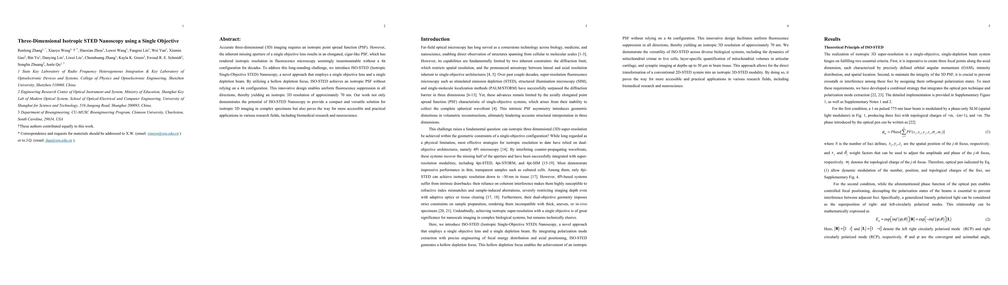 Accurate three-dimensional (3D) imaging requires an isotropic point spread function (PSF). However, the inherent missing aperture of a single objective lens results in an elongated, cigar-like PSF, which has rendered isotropic resolution in fluorescence microscopy seemingly insurmountable without a 4{\pi} configuration for decades. To address this long-standing challenge, we introduce ISO-STED (Isotropic Single-Objective STED) Nanoscopy, a novel approach that employs a single objective lens and a single depletion beam. By utilizing a hollow depletion focus, ISO-STED achieves an isotropic PSF without relying on a 4{\pi} configuration. This innovative design enables uniform fluorescence suppression in all directions, thereby yielding an isotropic 3D resolution of approximately 70 nm. Our work not only demonstrates the potential of ISO-STED Nanoscopy to provide a compact and versatile solution for isotropic 3D imaging in complex specimens but also paves the way for more accessible and practical applications in various research fields, including biomedical research and neuroscience.