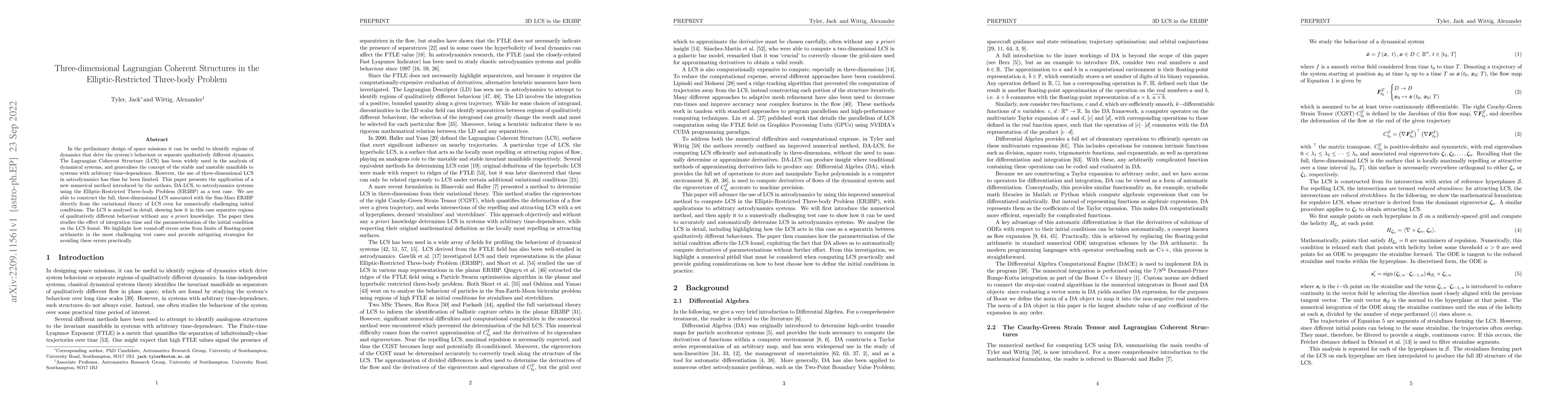 In the preliminary design of space missions it can be useful to identify regions of dynamics that drive the system's behaviour or separate qualitatively different dynamics. The Lagrangian Coherent Structure (LCS) has been widely used in the analysis of dynamical systems, and generalises the concept of the stable and unstable manifolds to systems with arbitrary time-dependence. However, the use of three-dimensional LCS in astrodynamics has thus far been limited. This paper presents the application of a new numerical method introduced by the authors, DA-LCS, to astrodynamics systems using the Elliptic-Restricted Three-body Problem (ER3BP) as a test case. We are able to construct the full, three-dimensional LCS associated with the Sun-Mars ER3BP directly from the variational theory of LCS even for numerically challenging initial conditions. The LCS is analysed in detail, showing how it in this case separates regions of qualitatively different behaviour without any a priori knowledge. The paper then studies the effect of integration time and the parameterisation of the initial condition on the LCS found. We highlight how round-off errors arise from limits of floating-point arithmetic in the most challenging test cases and provide mitigating strategies for avoiding these errors practically.