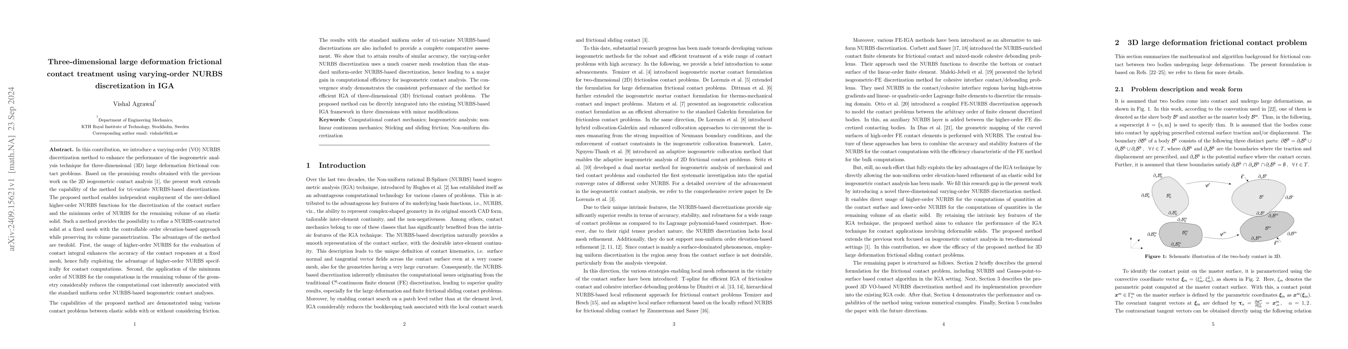 This paper introduces a varying-order NURBS discretization method to improve IGA for large deformation frictional contact problems in 3D. The method allows higher-order NURBS for contact surfaces and lower-order NURBS for the rest, enhancing accuracy and reducing computational costs.