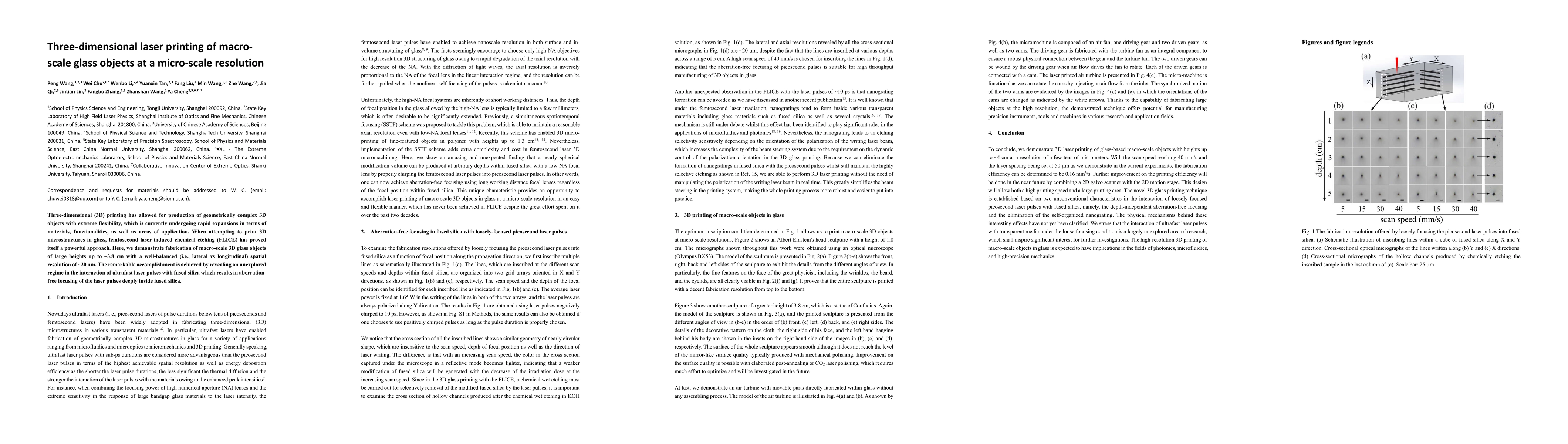 Three-dimensional (3D) printing has allowed for production of geometrically complex 3D objects with extreme flexibility, which is currently undergoing rapid expansions in terms of materials, functionalities, as well as areas of application. When attempting to print 3D microstructures in glass, femtosecond laser induced chemical etching (FLICE) has proved itself a powerful approach. Here, we demonstrate fabrication of macro-scale 3D glass objects of large heights up to ~3.8 cm with a well-balanced (i.e., lateral vs longitudinal) spatial resolution of ~20 {\mu}m. The remarkable accomplishment is achieved by revealing an unexplored regime in the interaction of ultrafast laser pulses with fused silica which results in aberration-free focusing of the laser pulses deeply inside fused silica.