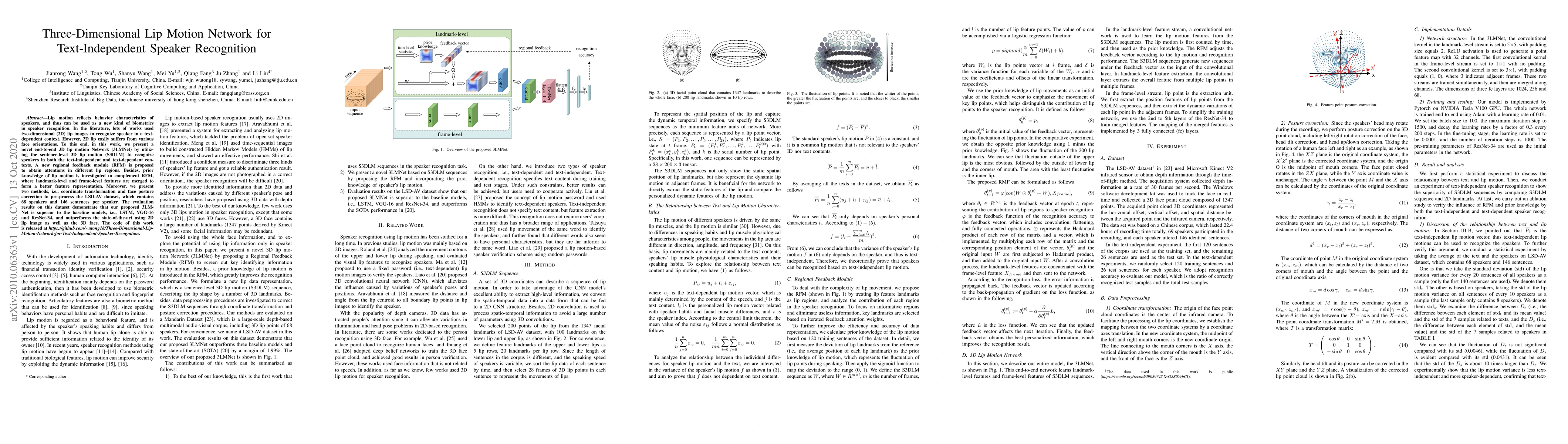 This paper introduces a novel 3D lip motion network (3LMNet) for text-independent speaker recognition using 3D lip motion data, which addresses the limitations of 2D lip images. The proposed 3LMNet incorporates a regional feedback module and leverages pre-processing techniques to improve recognition accuracy, outperforming baseline models and state-of-the-art methods.