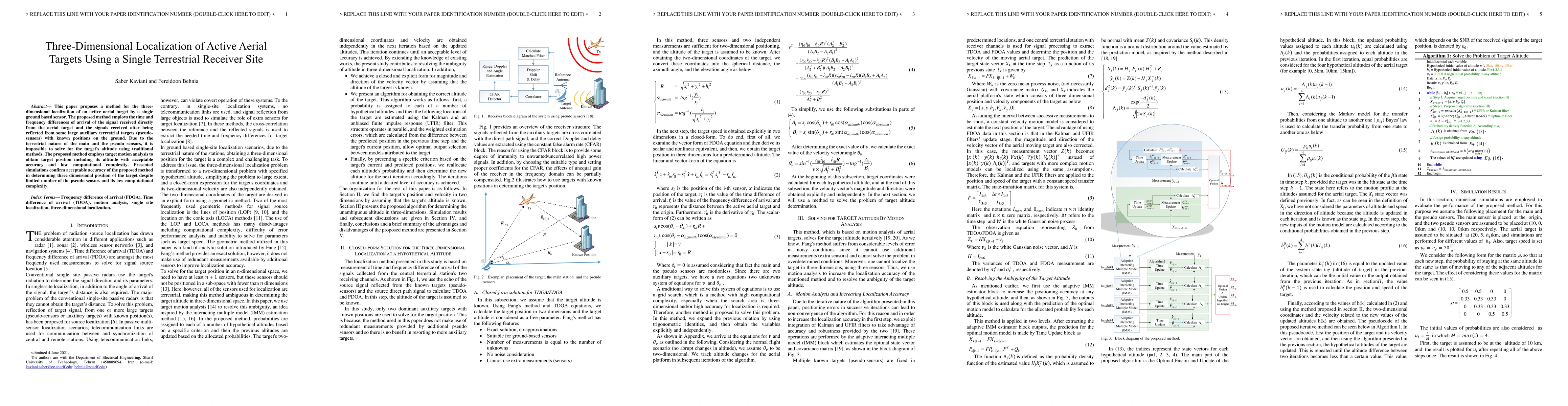 This paper proposes a method for the three-dimensional localization of an active aerial target by a single ground based sensor. The proposed method employs the time and frequency differences of arrival of the signal received directly from the aerial target and the signals received after being reflected from some large auxiliary terrestrial targets (pseudo-sensors) with known positions on the ground. Due to the terrestrial nature of the main and the pseudo sensors, it is impossible to solve for the target's altitude using traditional methods. The proposed method employs target motion analysis to obtain target position including its altitude with acceptable accuracy and low computational complexity. Presented simulations confirm acceptable accuracy of the proposed method in determining three dimensional position of the target despite limited number of the pseudo sensors and its low computational complexity.