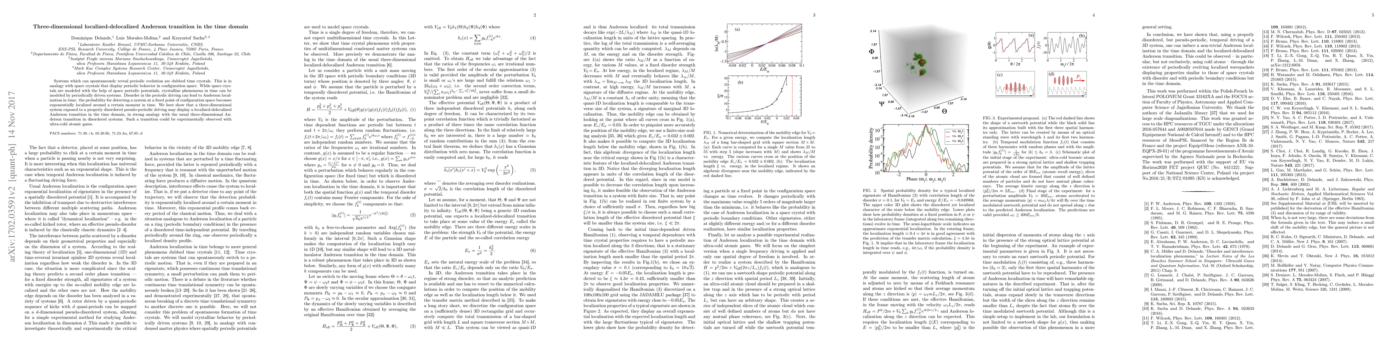 This paper investigates a three-dimensional localized-delocalized Anderson transition in time-driven systems, analogous to the spatial Anderson transition. It demonstrates that disordered pseudo-periodic driving can lead to time crystals that exhibit localized behavior, potentially observable in ultra-cold atomic gases.