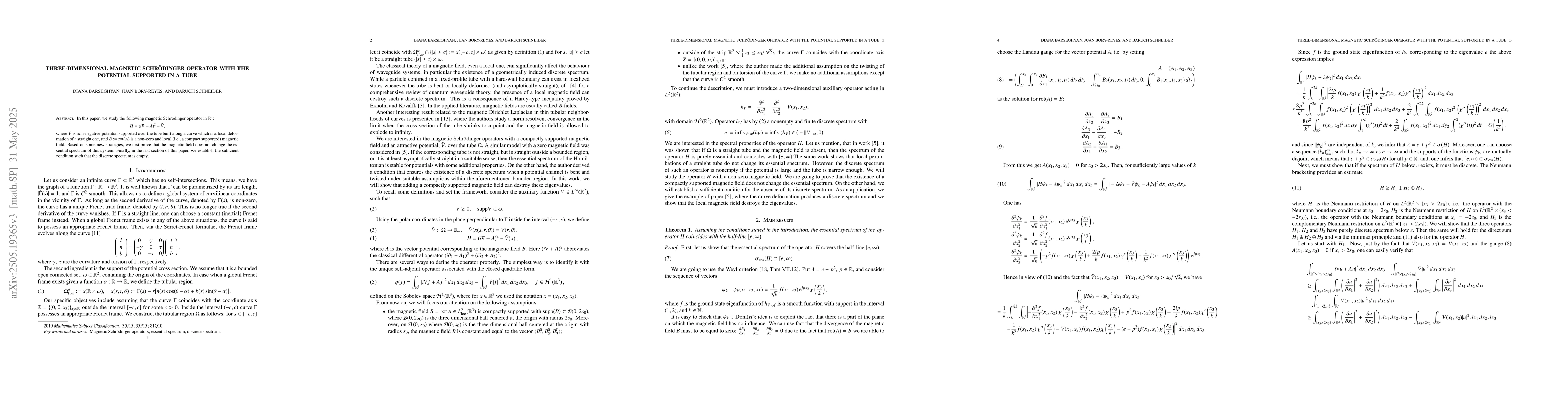 The paper presents a proof that a nonzero local magnetic field does not change the essential spectrum of the magnetic Schrödinger operator with a potential supported in a tube, along with a condition for the absence of discrete spectrum.