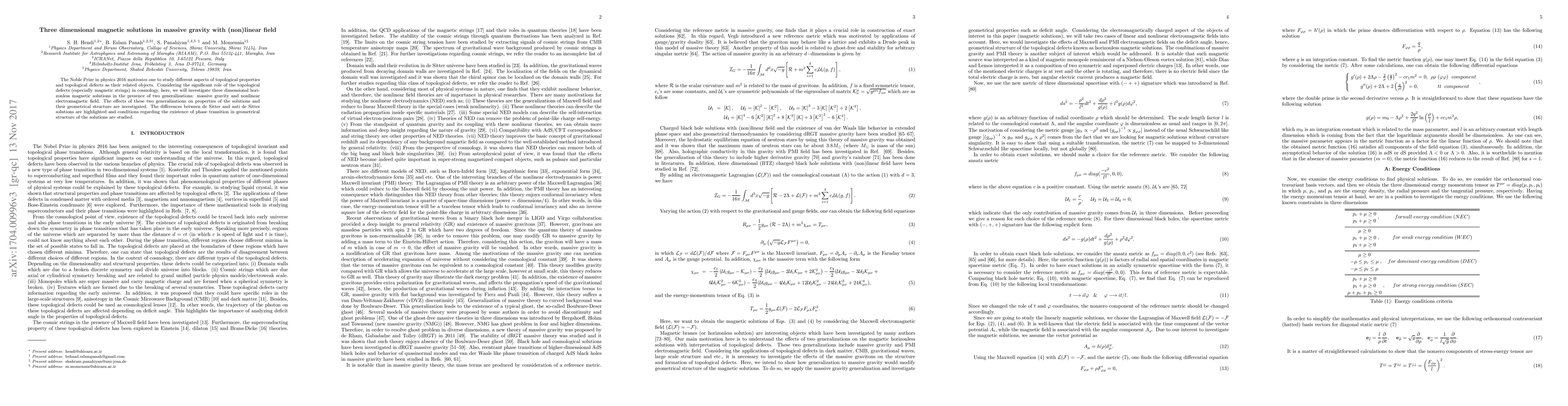 The Noble Prize in physics 2016 motivates one to study different aspects of topological properties and topological defects as their related objects. Considering the significant role of the topological defects (especially magnetic strings) in cosmology, here, we will investigate three dimensional horizonless magnetic solutions in the presence of two generalizations: massive gravity and nonlinear electromagnetic field. The effects of these two generalizations on properties of the solutions and their geometrical structure are investigated. The differences between de Sitter and anti de Sitter solutions are highlighted and conditions regarding the existence of phase transition in geometrical structure of the solutions are studied.