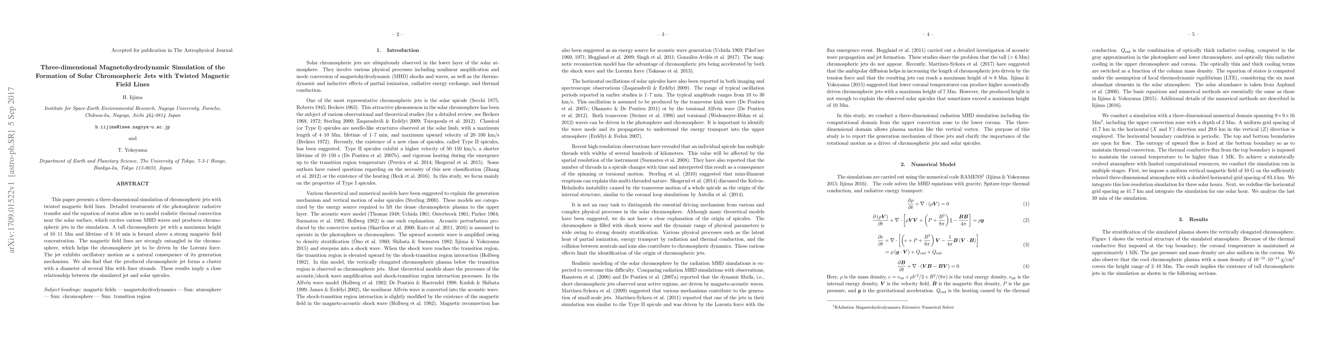 This paper simulates the formation of solar chromospheric jets driven by twisted magnetic field lines, revealing a jet with a height of 10-11 Mm and a lifetime of 8-10 min, exhibiting oscillatory motion and forming clusters resembling solar spicules.