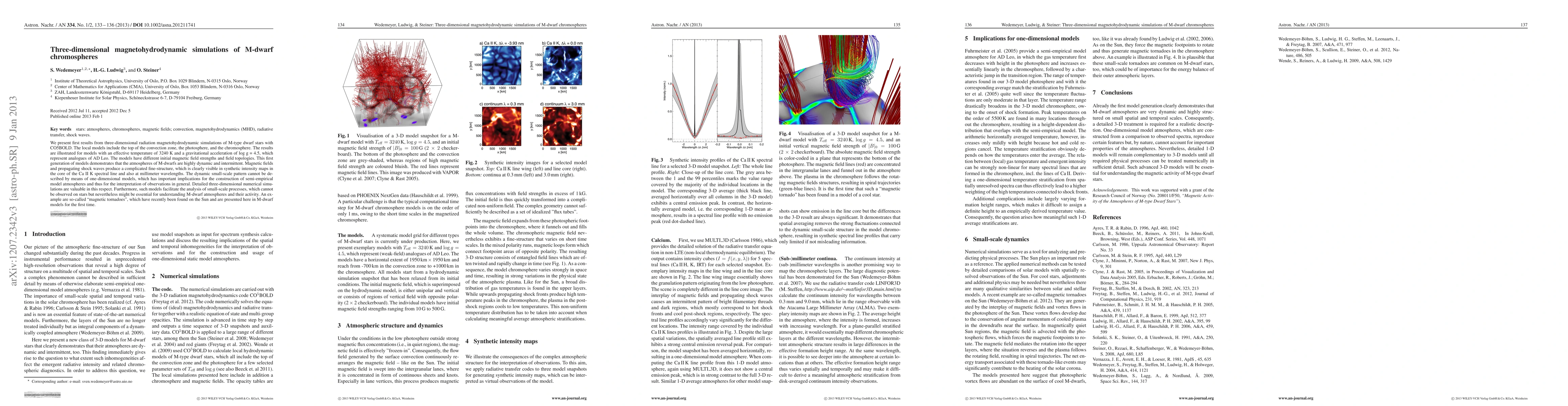 This paper presents the first three-dimensional magnetohydrodynamic simulations of M-dwarf chromospheres using the CO5BOLD model, revealing highly dynamic and intermittent atmospheres driven by magnetic fields and shock waves. The simulations highlight the importance of three-dimensional models over one-dimensional approaches for accurately interpreting M-dwarf observations and understanding small-scale atmospheric processes.