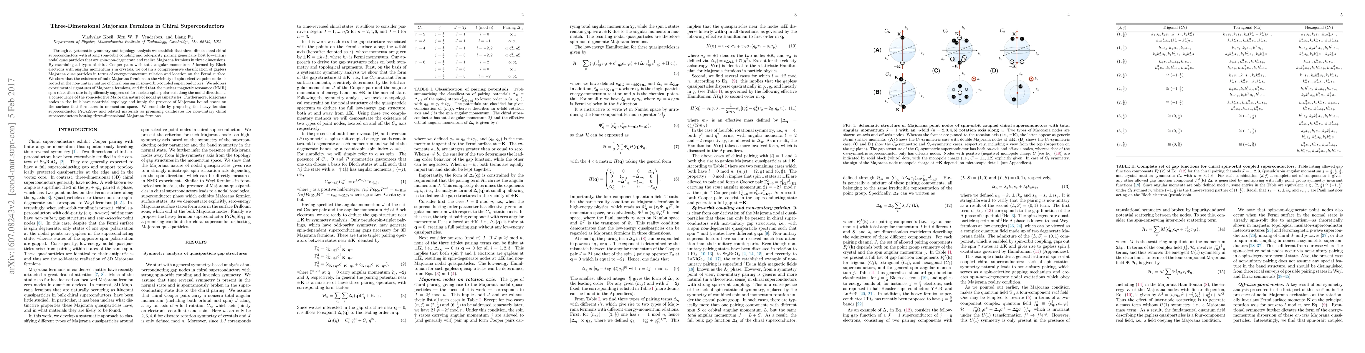 This research establishes that three-dimensional chiral superconductors with strong spin-orbit coupling and odd-parity pairing can host Majorana fermions. It proposes heavy fermion superconductors like PrOs$_4$Sb$_{12}$ as candidates for hosting these unique, topologically protected quasiparticles, with notable experimental signatures including suppressed NMR spin relaxation rates.