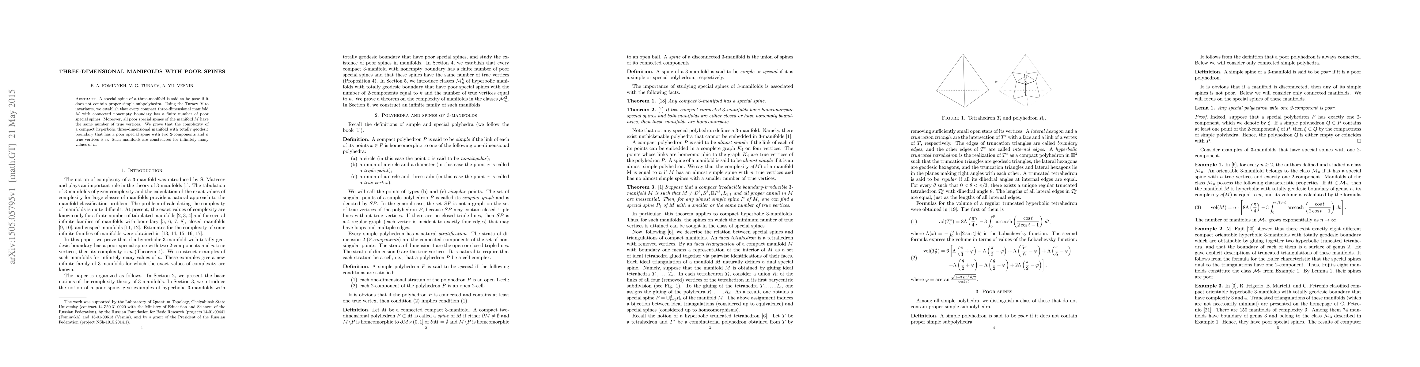 This paper investigates three-dimensional manifolds with poor spines, demonstrating that compact manifolds with connected nonempty boundaries possess a finite number of such spines. It further shows that all poor spines in such manifolds share the same vertex count and proves that the complexity of hyperbolic manifolds with poor spines is determined by their vertex count.