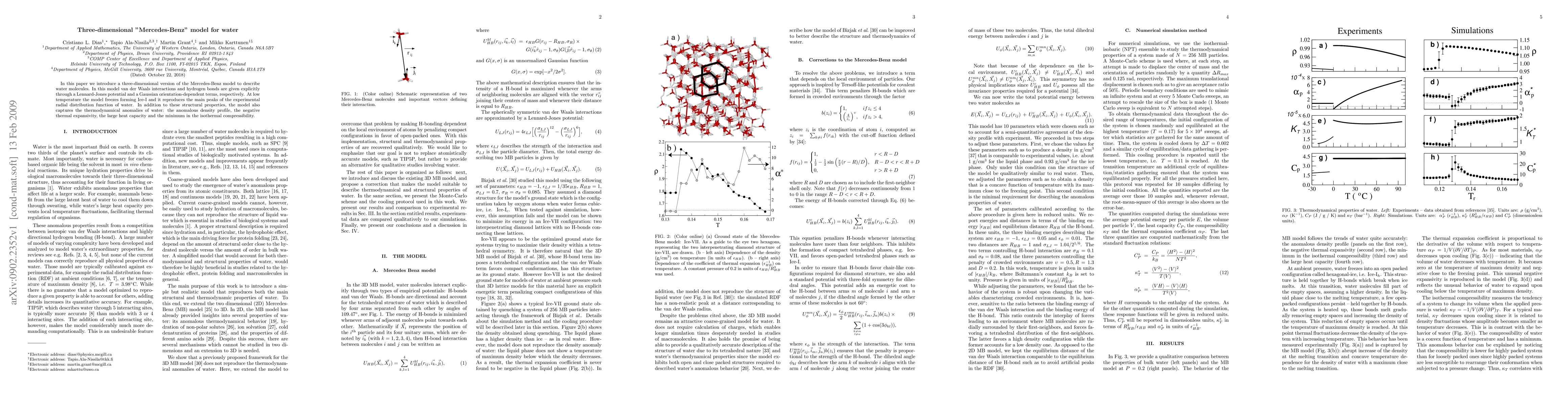 This paper presents a three-dimensional model of water molecules resembling the Mercedes-Benz structure, incorporating van der Waals and hydrogen bonding interactions. The model accurately reproduces the structural and thermodynamical anomalies of water, including ice formation and anomalous density profile.