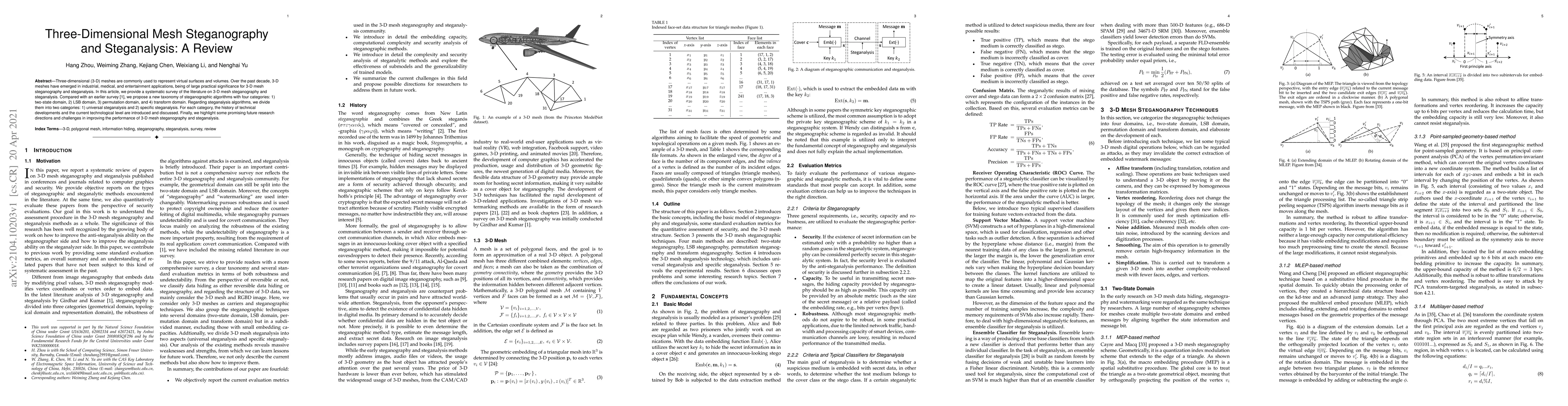 This paper provides a comprehensive review of 3-D mesh steganography and steganalysis, proposing a new taxonomy for steganographic algorithms and categorizing steganalysis methods. It discusses the evolution and current state of these techniques and outlines future research directions.