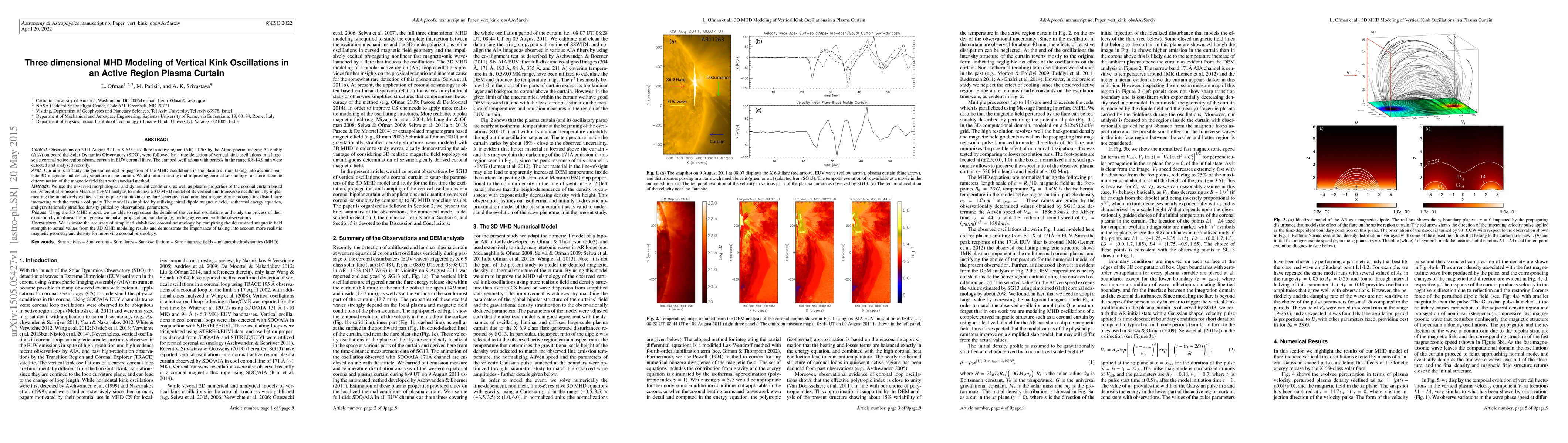 Observations on 2011 August 9 of an X6.9-class flare in active region (AR) 11263 by the Atmospheric Imaging Assembly (AIA) on-board the Solar Dynamics Observatory (SDO), were followed by a rare detection of vertical kink oscillations in a large-scale coronal active region plasma curtain in EUV coronal lines. The damped oscillations with periods in the range 8.8-14.9 min were detected and analyzed recently. Our aim is to study the generation and propagation of the MHD oscillations in the plasma curtain taking into account realistic 3D magnetic and density structure of the curtain. We also aim at testing and improving coronal seismology for more accurate determination of the magnetic field than with standard method. We use the observed morphological and dynamical conditions, as well as plasma properties of the coronal curtain based on Differential Emission Measure (DEM) analysis to initialize a 3D MHD model of its vertical and transverse oscillations by implementing the impulsively excited velocity pulse mimicking the flare generated nonlinear fast magnetosonic propagating disturbance interacting with the curtain obliquely. The model is simplified by utilizing initial dipole magnetic field, isothermal energy equation, and gravitationally stratified density guided by observational parameters. Using the 3D MHD model, we are able to reproduce the details of the vertical oscillations and study the process of their excitation by nonlinear fast magnetosonic pulse, propagation, and damping, finding agreement with the observations. We estimate the accuracy of simplified slab-based coronal seismology by comparing the determined magnetic field strength to actual values from the 3D MHD modeling results and demonstrate the importance of taking into account more realistic magnetic geometry and density for improving coronal seismology.